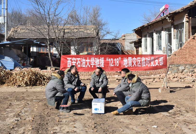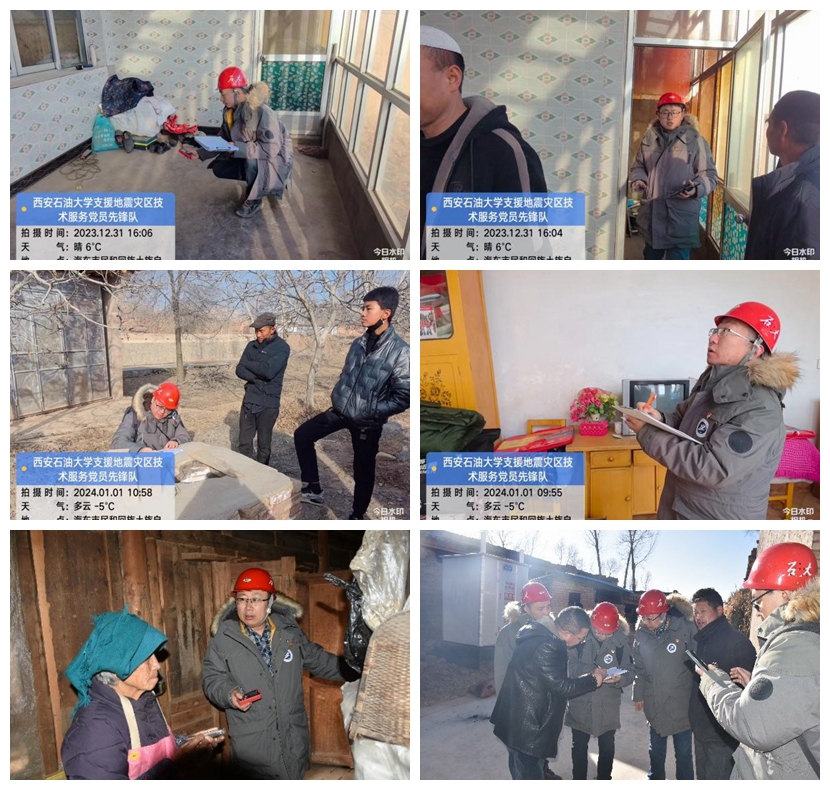 驰援12·18地震灾区临时党支部”,由队长陈涛担任临时党支部书记,随即制定工作方案,对人员进行分工。具体分工如下:陈涛负责受灾群众灾后情绪疏导、房屋受损情况问询和控制性尺寸测量校核,代建波负责房屋危险性检查记录、朱熹育负责房屋结构平面图绘制和危险点标注、孙杲辰负责危险点记录和照片的实时上传、兰官奇负责现场影像记录和工作日志的撰写。