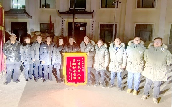 赠送印有“心系灾区人民、勇担社会责任”的锦旗。