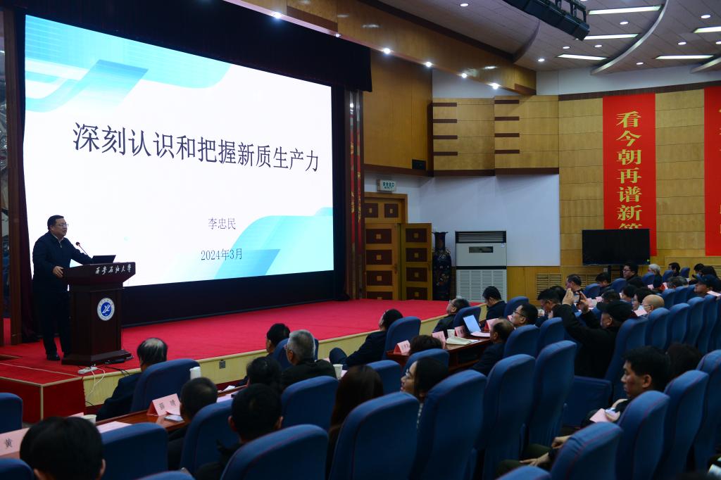 李忠民领学了习近平总书记在全国两会期间的重要讲话精神,就如何深刻把握因地制宜发展新质生产力,从马克思主义生产力理论、世界生产力发展概况、深刻认识把握新质生产力、因地制宜发展新质生产力四个方面作了专题报告。李忠民表示,新质生产力特点是创新,关键在质优,本质是先进生产力。发展新质生产力就是要积极培育新能源、新材料、先进制造、电子信息等战略性新兴产业,积极培育未来产业,因地制宜加快发展新质生产力,增强发展新动能。要深入学习领会习近平总书记重要讲话和全国两会精神,深刻把握当前国际国内形势,深刻领会因地制宜发展新质生产力、全面深化改革开放、促进区域协调发展、加强生态文明建设、形成推动发展强大合力的重要内涵,在奋力谱写陕西新篇、争做西部示范中展现新作为。