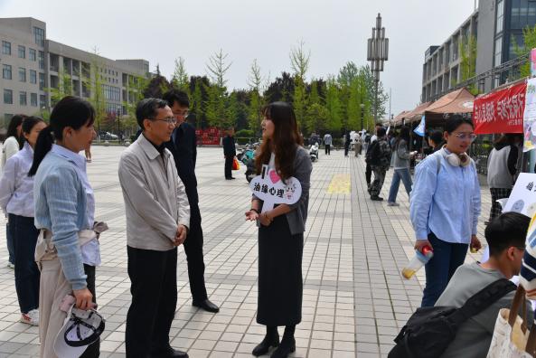 活动现场,张木亲临每个展台,并与学生们交流了生活、学习、人际交往的感受,向院(系)心理专干和班级心理委员了解了“一院一品”创意与日常工作中的困难,在各展台询问了每项活动的心理意义,并参与体验了一些项目,对此次“油缘会”户外体验活动给予了充分肯定,并鼓励多举办师生喜闻乐见的心理育人实践活动。
