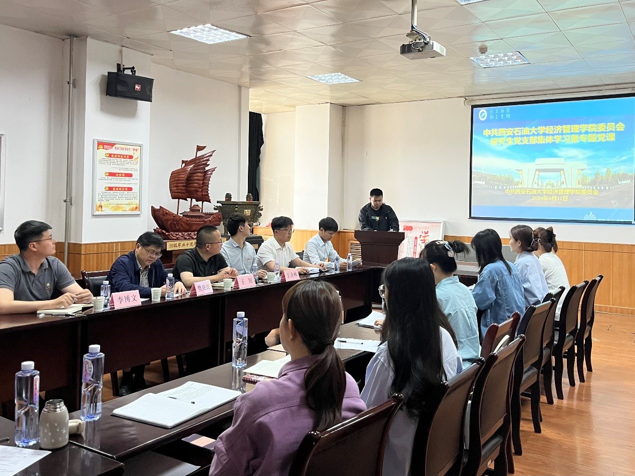 2022级学硕党支部在雁塔校区东方石油楼1507会议室召开支部党员大会,总会计师樊晓民以普通党员身份参加支部学习,与支部党员同志一起交流,并讲授专题党课。