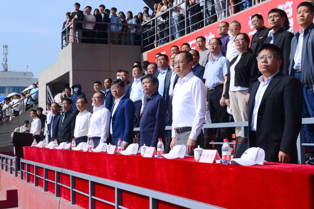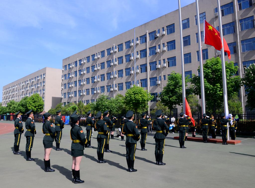 入场仪式完毕,全场起立。在雄壮的国歌声中,大会举行了庄严的升旗仪式,随着五星红旗冉冉升起,全场师生齐唱国歌。