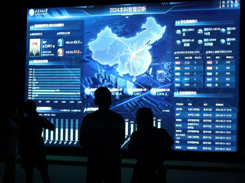 迎新现场设立了网络可视化大数据电子屏幕,实时呈现全校本科新生报到情况,包含学生基本信息、所在省份,及有多少人与该名同学来自相同的省份、高中、相同的生日、姓氏、名字等有趣的信息,直观展现出新生从祖国各地汇聚到德州扑克
