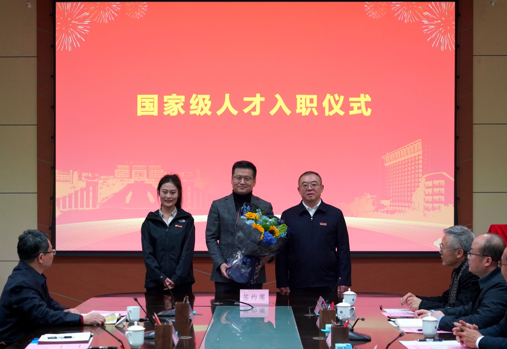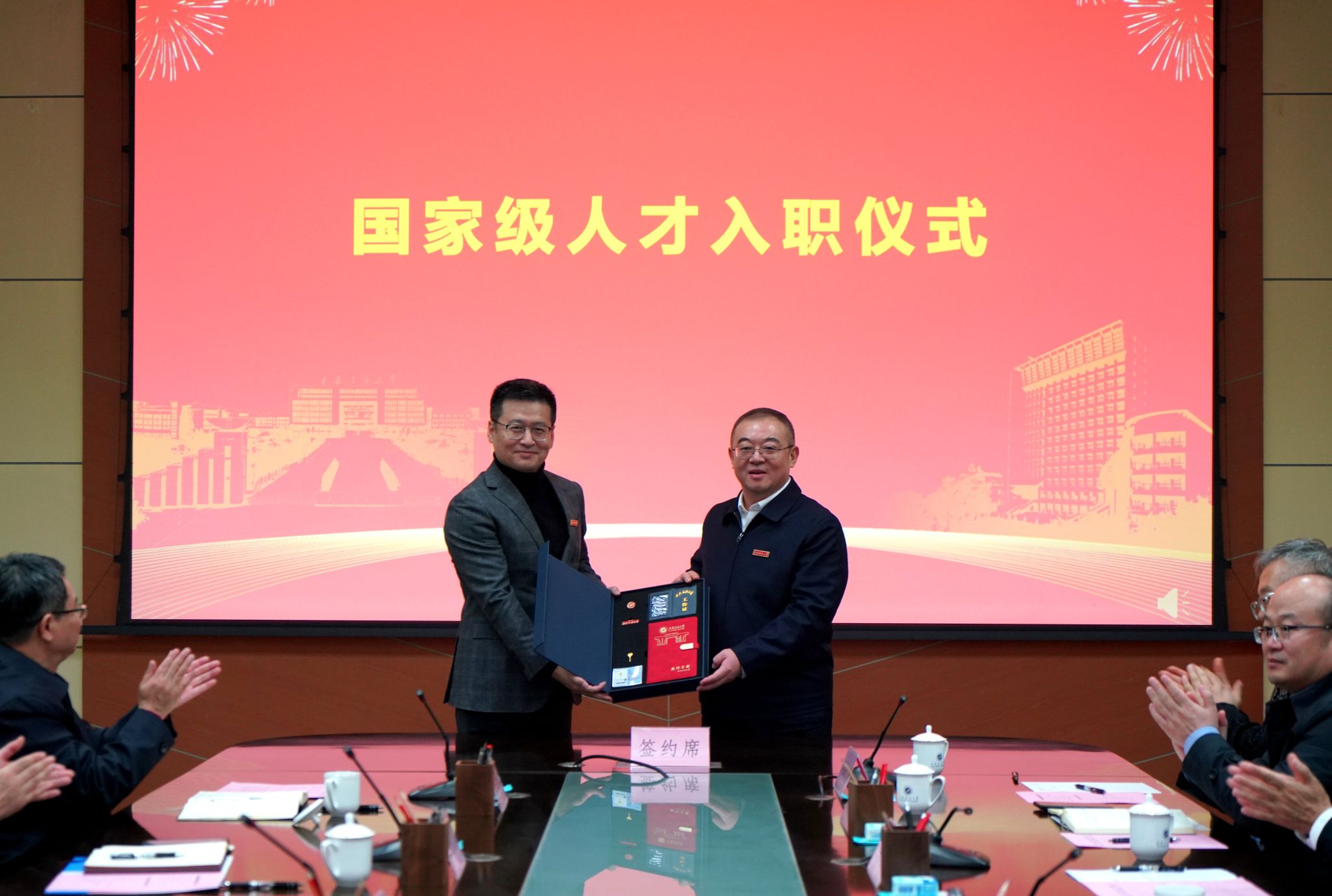 常江为崔仕章教授佩戴校徽并颁发了人才入职专属礼盒。