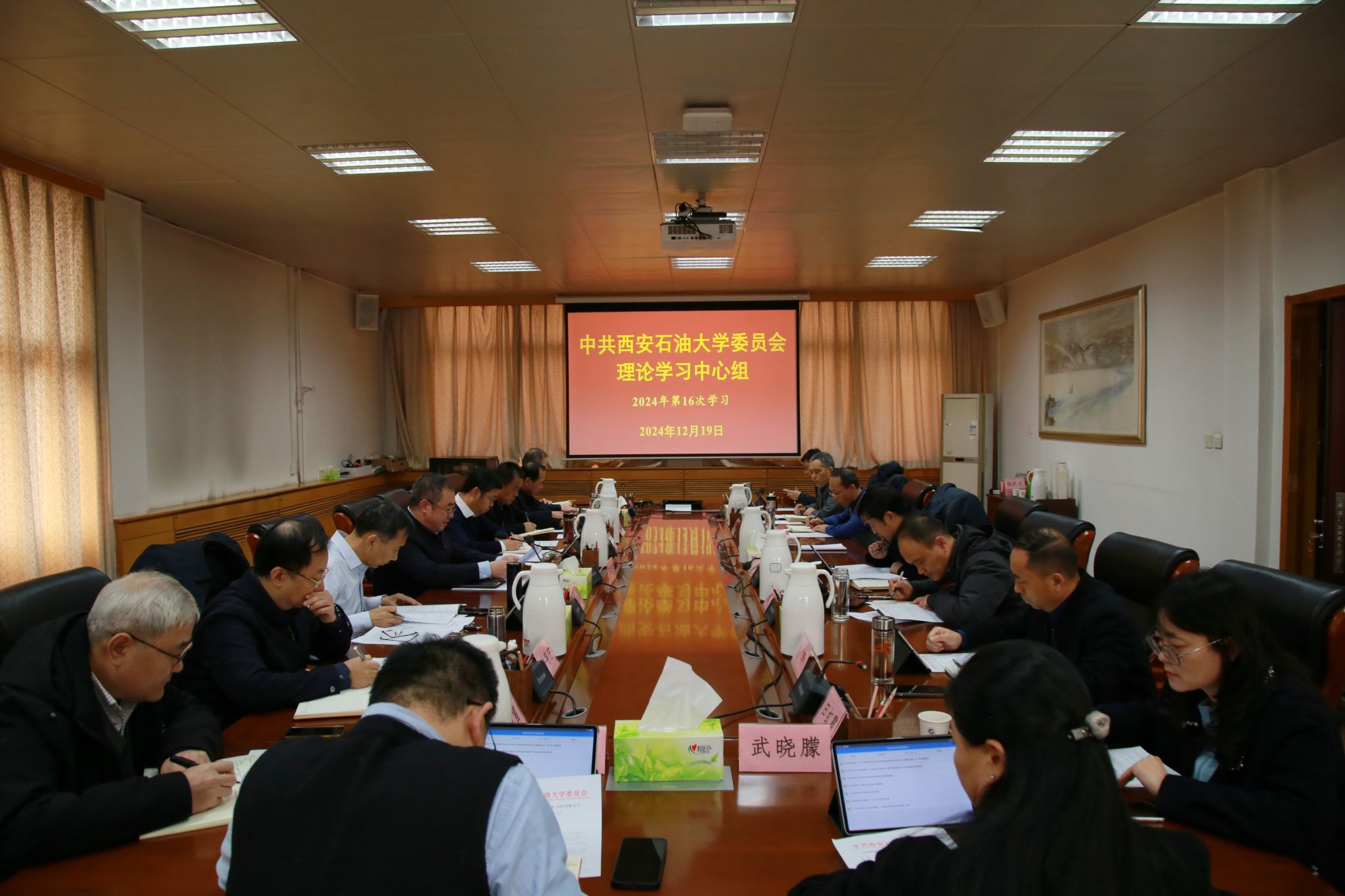 12月19日下午,校党委理论学习中心组第16次学习会在雁塔校区行政楼五楼会议室召开,深入学习习近平总书记在省部级主要领导干部学习贯彻党的二十届三中全会精神专题研讨班上,在第四次“一带一路”建设工作座谈会上,在全国教育大会上,在中央政治局第十七次、十八次集体学习时的重要讲话精神,关于党史学习教育、对新时代马克思主义理论研究和建设工程作出的重要指示,致中山大学建校100周年的贺信,关于教育、人才工作的重要论述等,并重温习近平总书记在第十个国家宪法日作出的重要指示。校党委书记常江主持并讲话,校党政领导王进富、张木、程永清、杨战社、苏文甫、张君涛、赵健,校党委理论学习中心组成员参加会议。