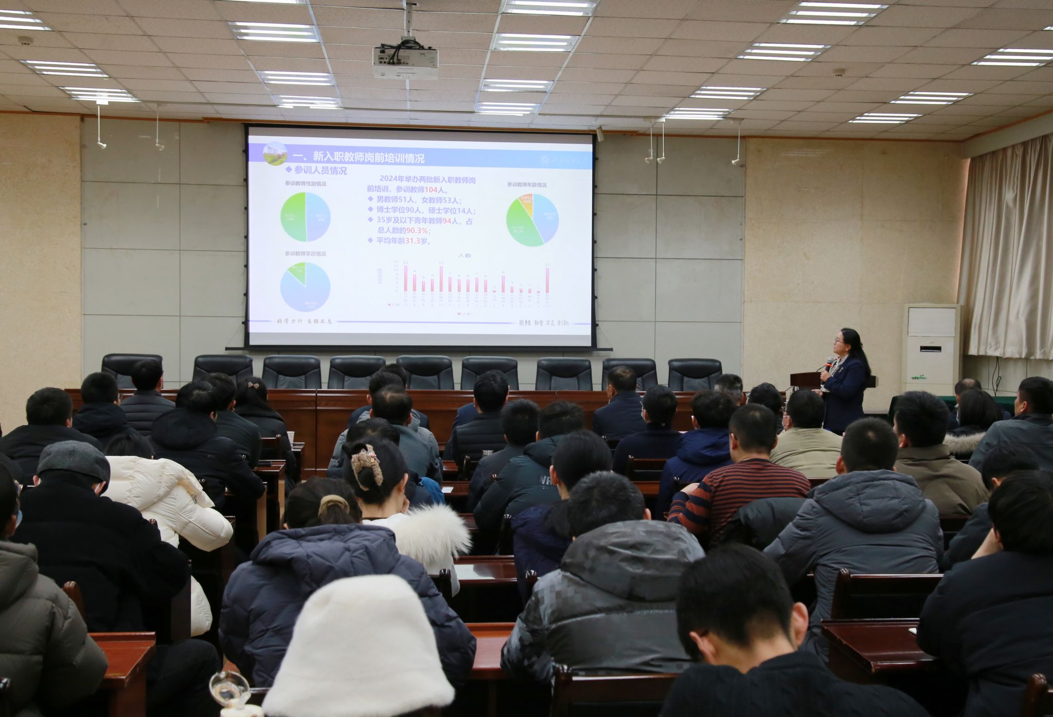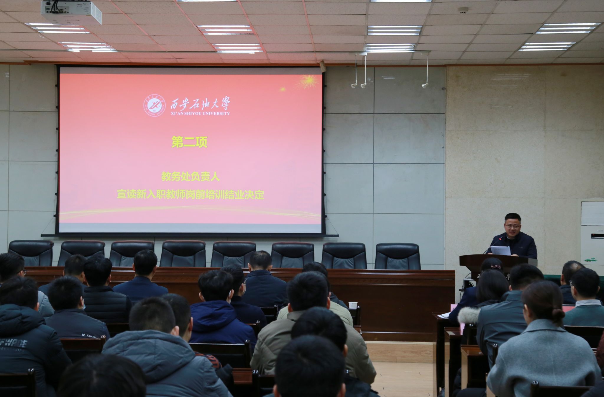 教务处副处长马加传宣读了《关于准予王海洋、李军等104名新入职教师岗前培训结业的决定》。