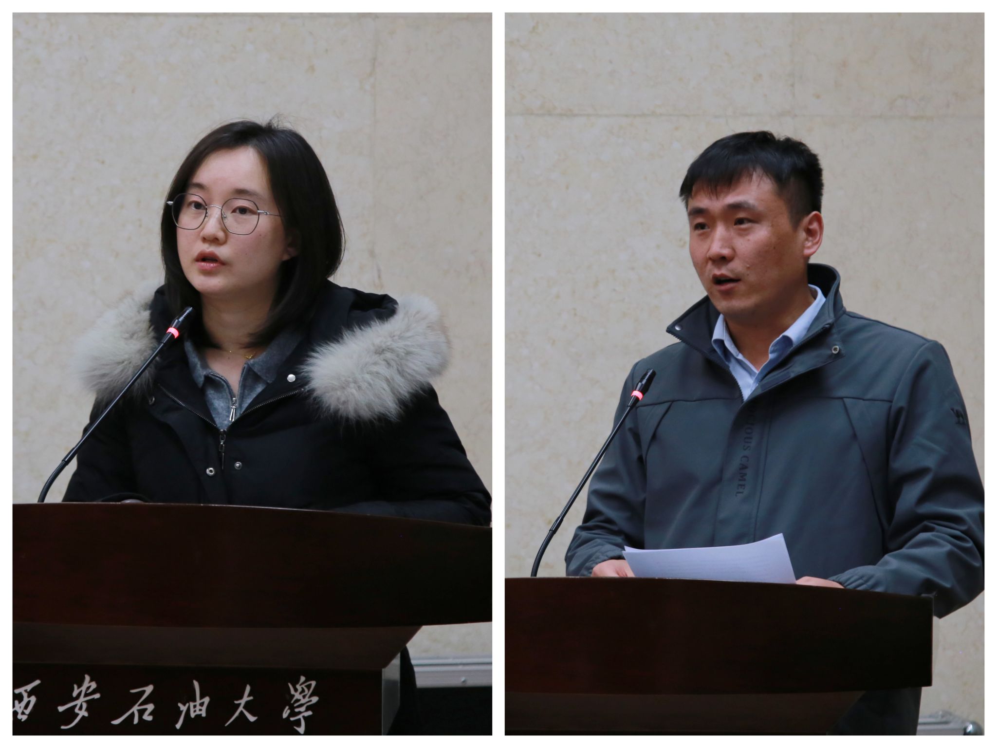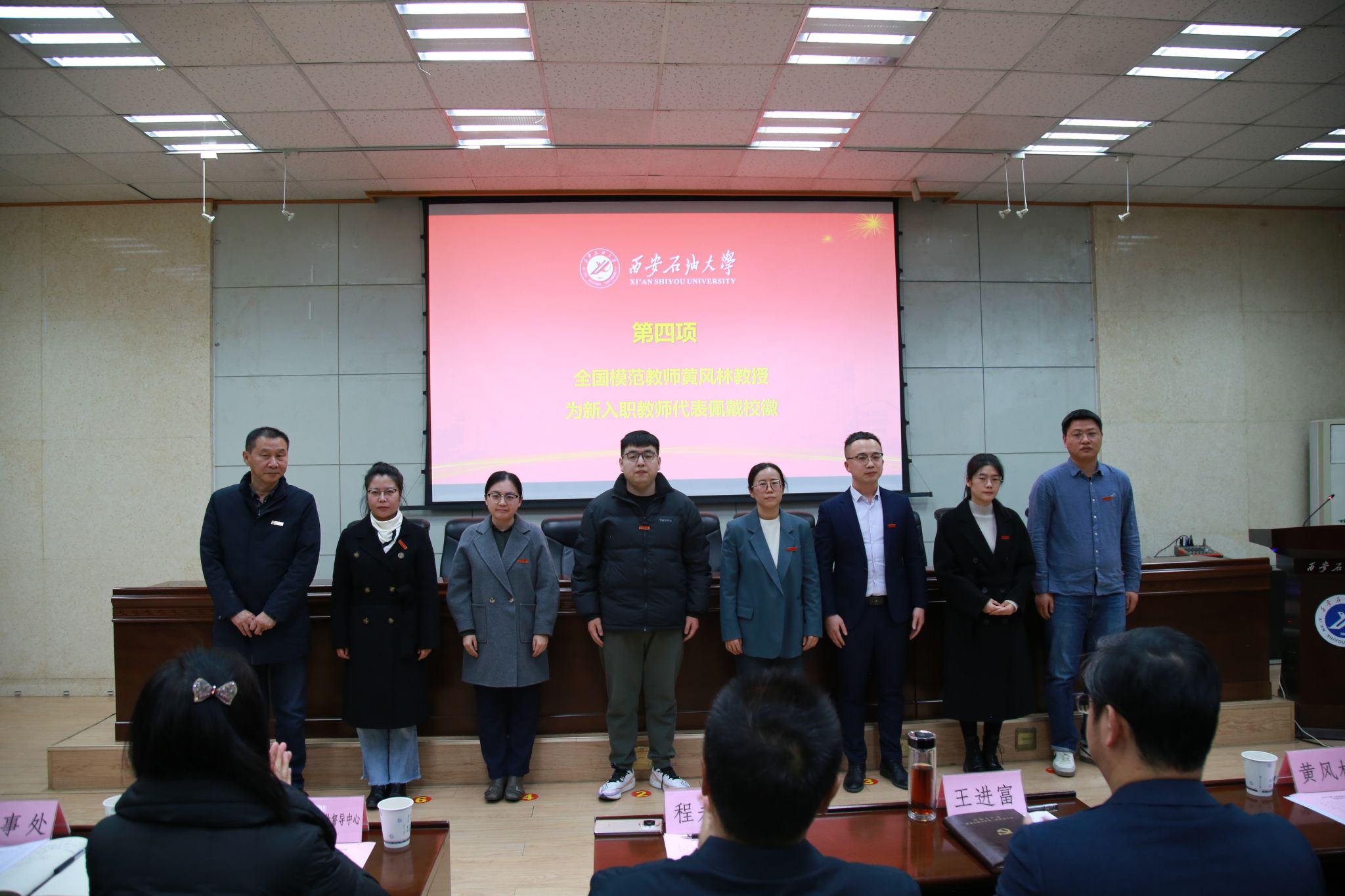 黄风林教授为新入职教师代表佩戴校徽,传递出一份深深的嘱托,也象征着教育精神的薪火相传。青年教师代表、石油工程德州扑克