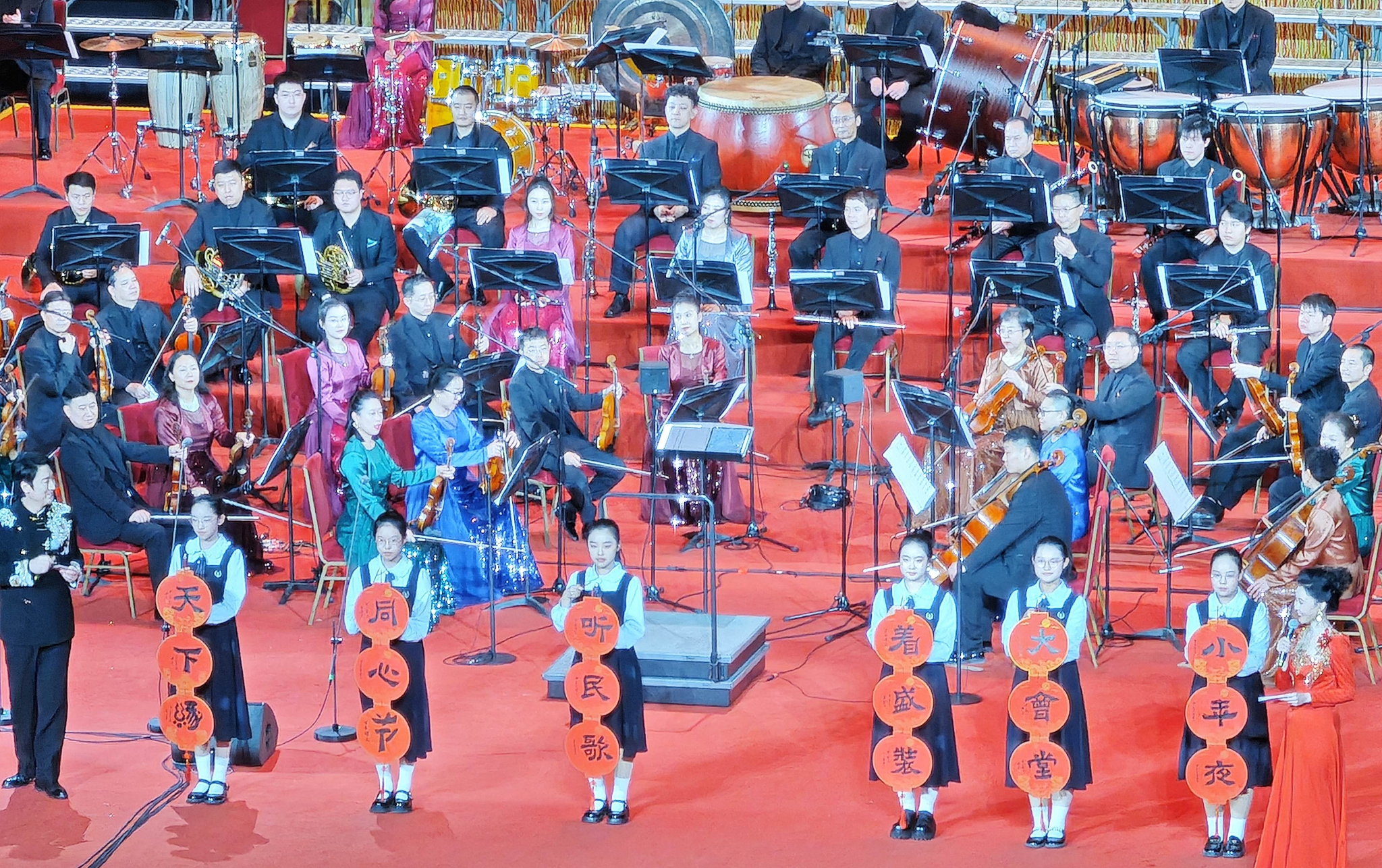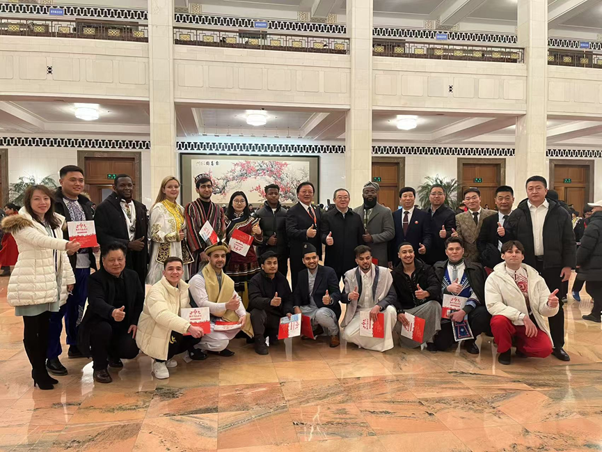 国际学生身着民族传统服饰,向主办方分享了对春节申遗成功走向世界的理解和现场观演的感受,为晚会增添了异域色彩和国际氛围,契和了“”小年夜、大会堂、听民歌、着盛装、同心节、天下缘”的演出定位,也丰富了国情教育内容。
