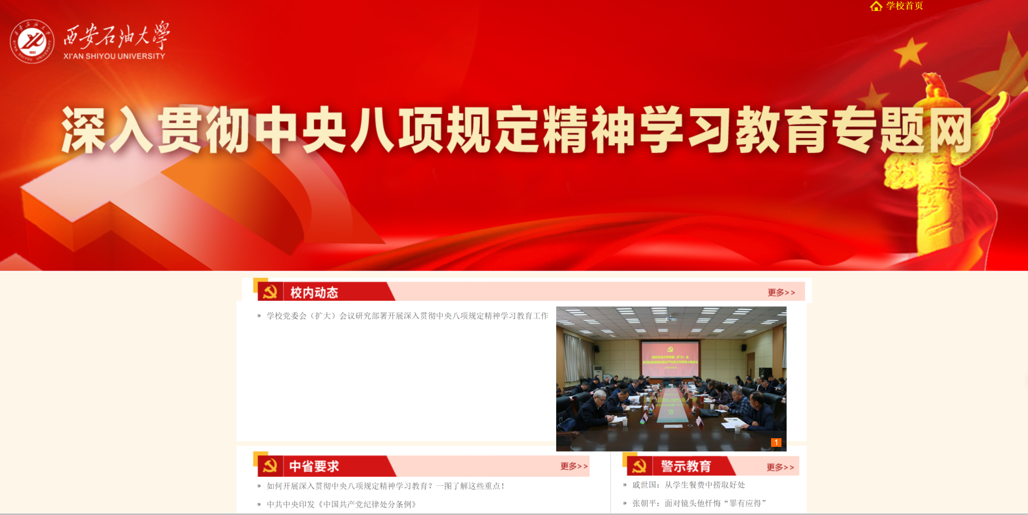 及各部门、各院系开展学习教育活动的动态新闻;“中省要求”传达中央、陕西省开展深入贯彻中央八项规定精神学习教育的部署要求;“理论学习”转载权威专家对中央八项规定精神的解读文章,以及主流媒体关于学习教育活动的言论评述;“警示教育”主要展示违反中央八项规定精神的典型案例、深度剖析。