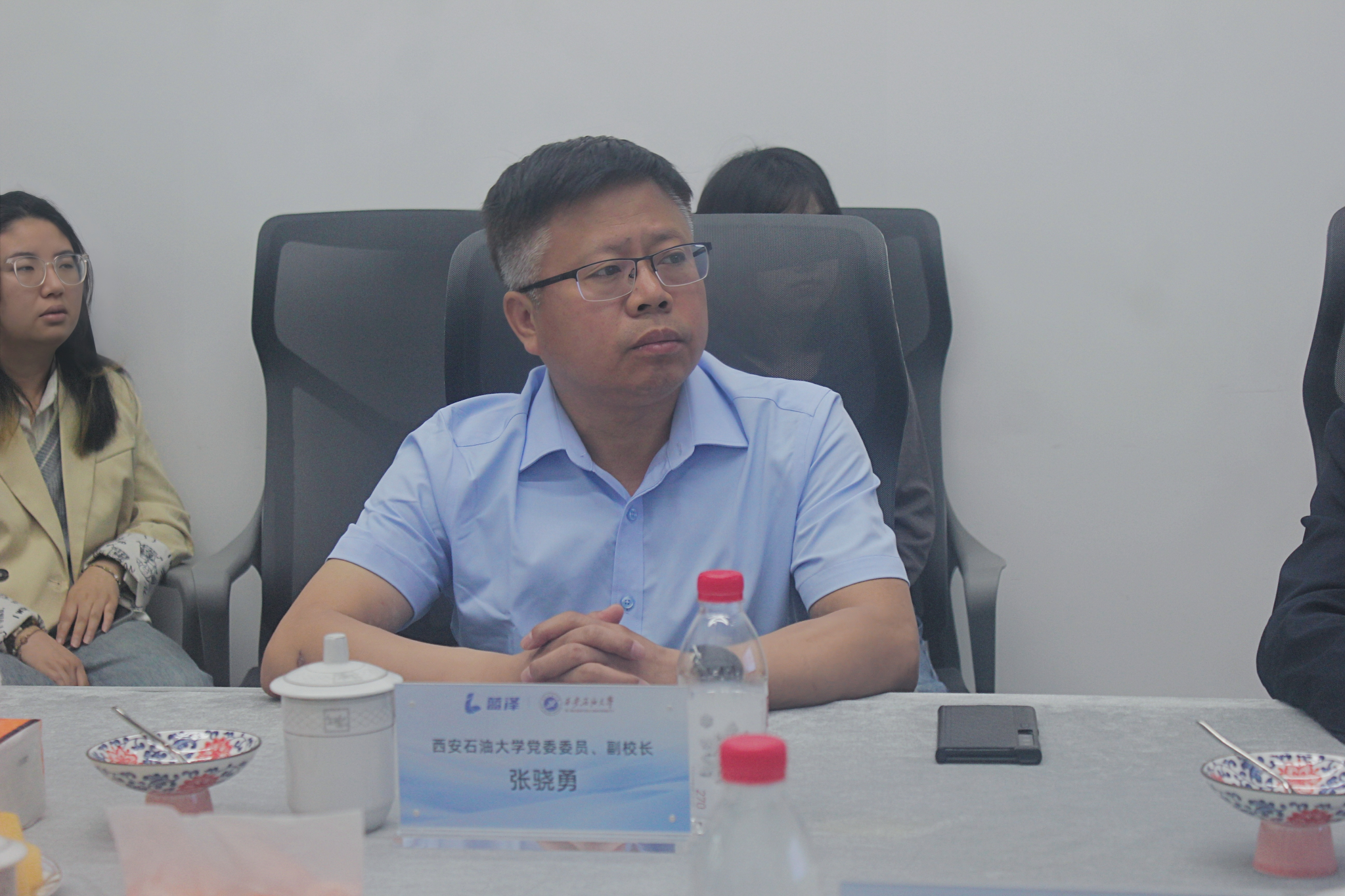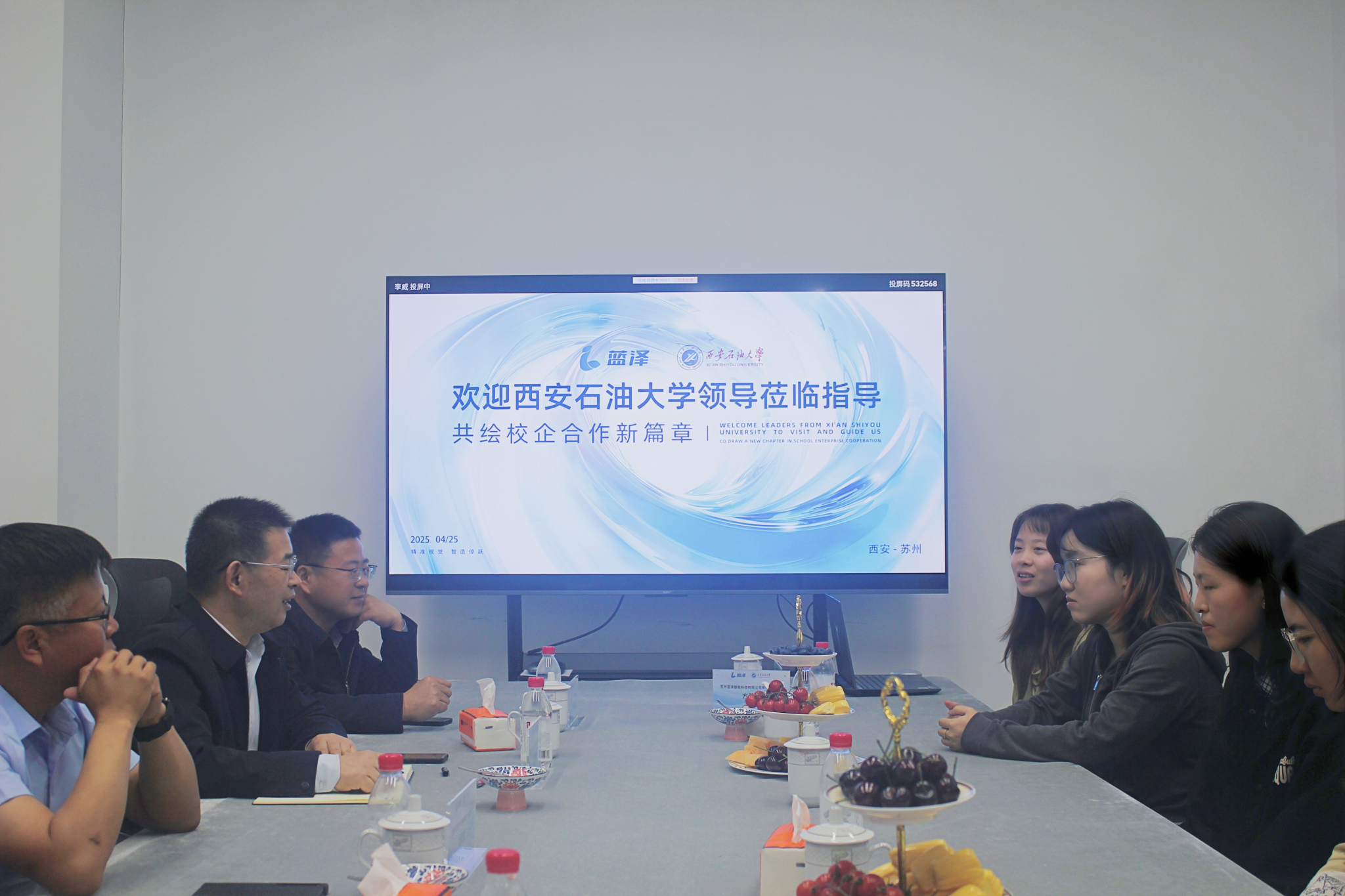 在苏州蓝泽智能科技有限公司,张骁勇一行在公司董事长闫奋娥、总经理赵中伟及相关部门负责人陪同下参观了企业生产车间和产品展厅,并就实习实践合作、科研成果转化、校企合作共建实验室等进行了交流座谈。