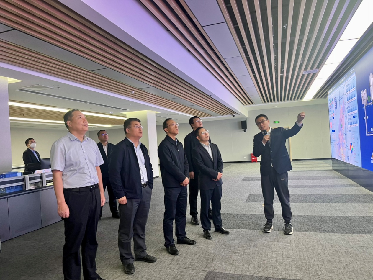 张君涛一行首先参观了榆能集团生产监控室,观看了矿山安全风险监测预警系统、煤矿工艺流程图、火力发电工艺流程图以及实时生产动态数据等,详细了解生产状况。