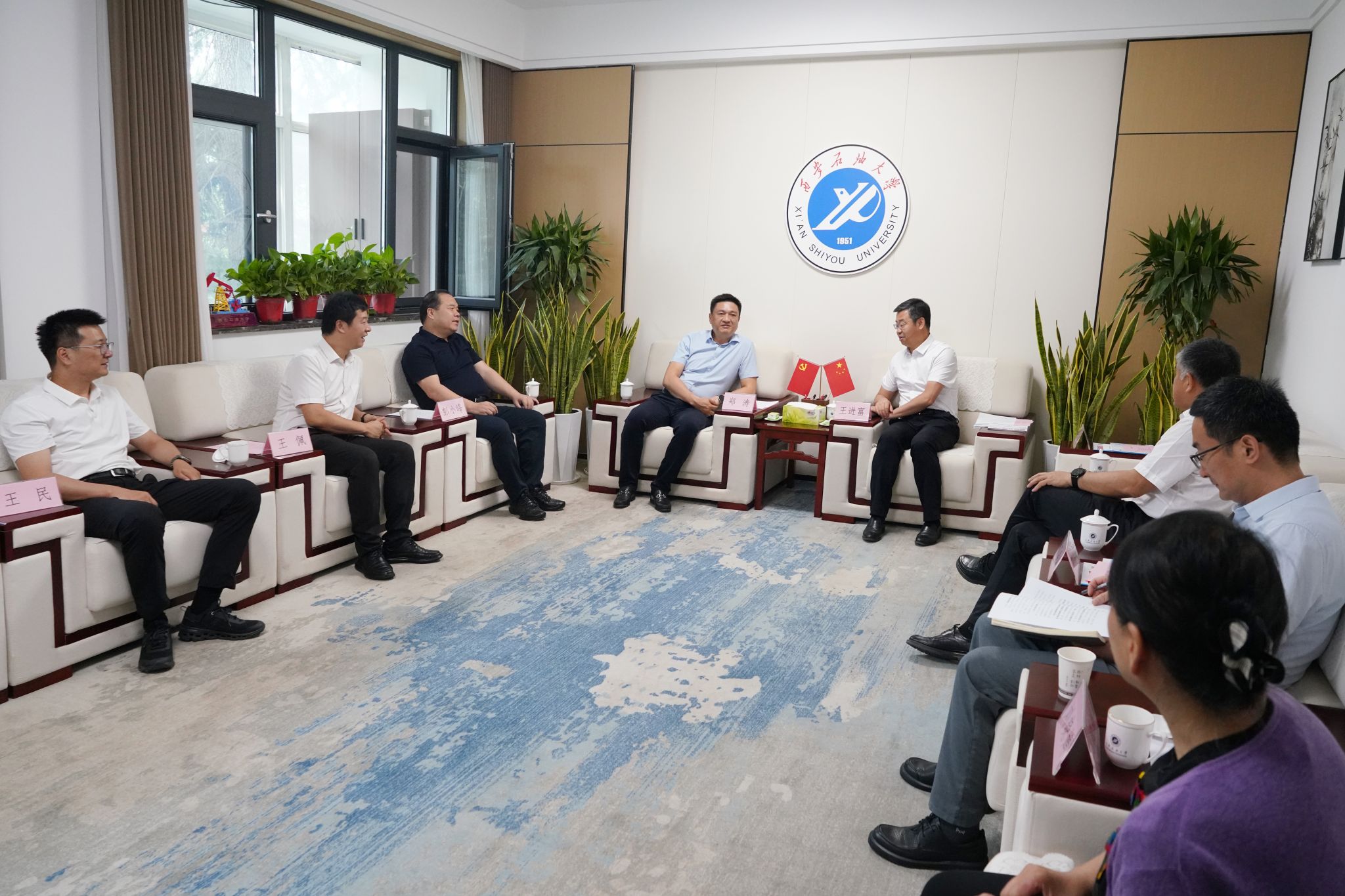 校长王进富、党委副书记张木在行政楼接待室会见来访客人。