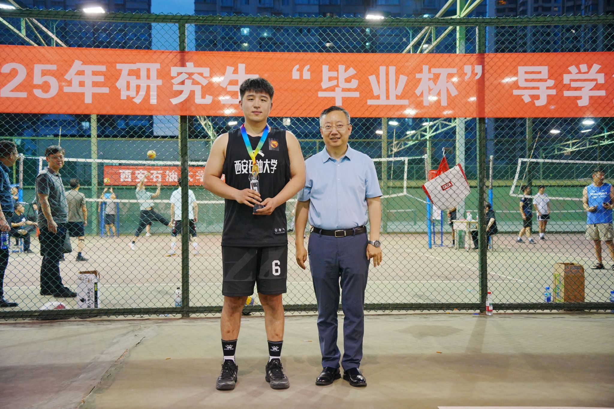 2025年研究生“毕业杯”导学篮球赛闭幕式暨颁奖典礼在雁塔校区篮球场举行。校长王进富、副校长种宇宏出席闭幕颁奖仪式。研究生工作部、研究生院、团委、体育德州扑克