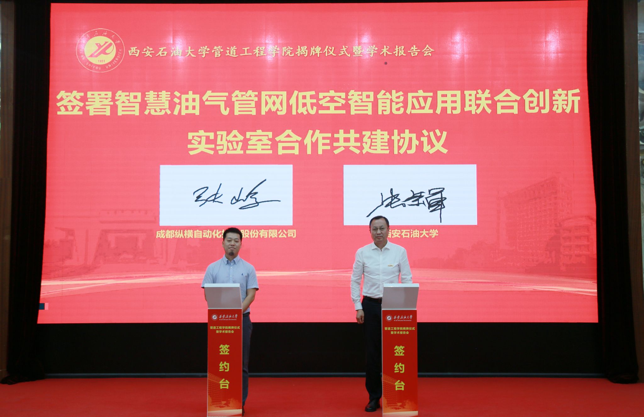 副校长张荣军与成都纵横自动化技术股份有限公司副总经理张峻代表校企双方签署“智慧油气管网低空智能应用联合创新实验室”合作共建协议。
