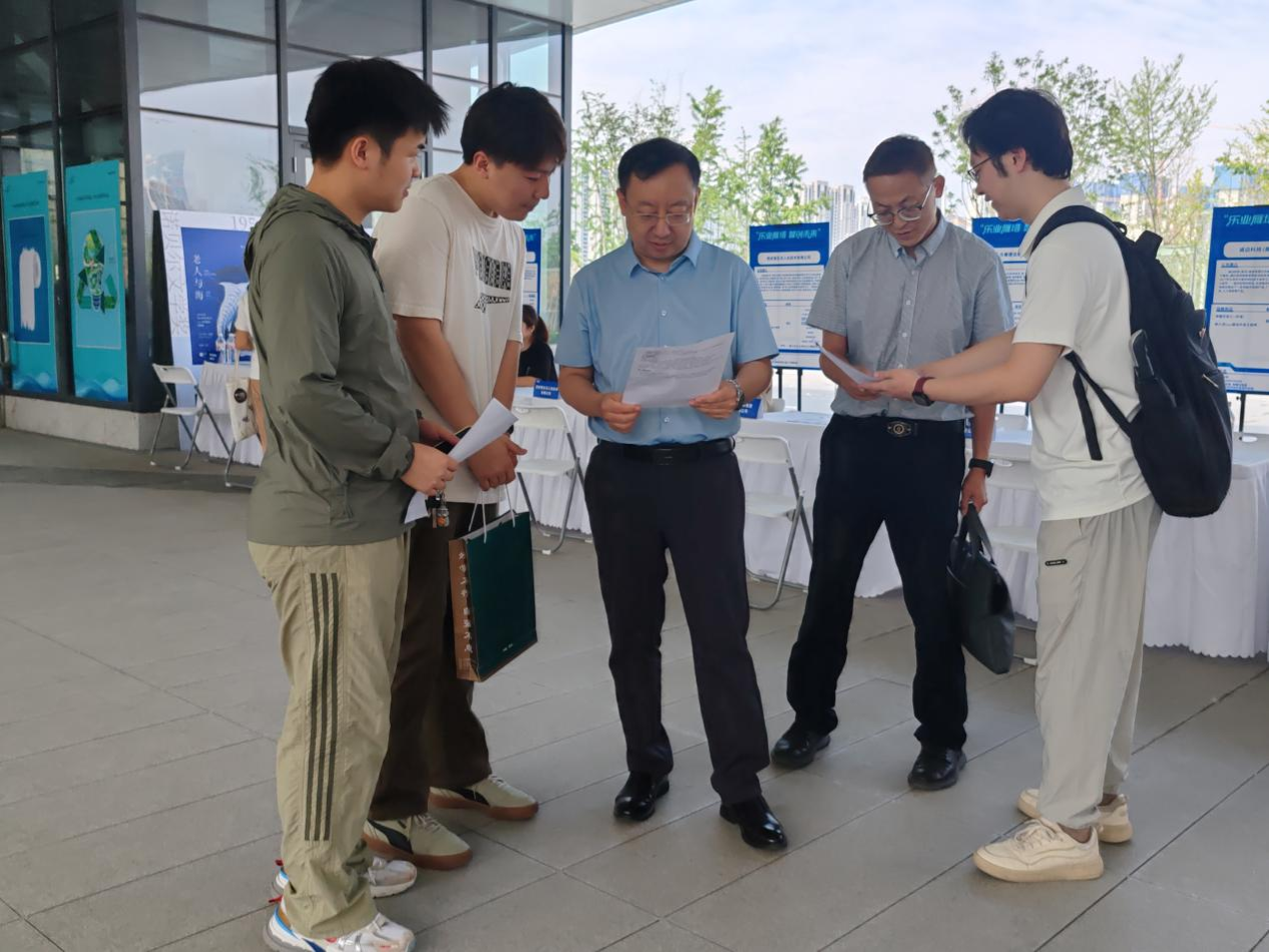 参会学生亲切交谈,翻阅学生求职简历,并结合当前就业形势为同学们提出几点就业建议:一是要明确职业方向,做好职业规划,树立正确的就业观;二是要夯实专业基础,全面提升就业能力,增强求职竞争力;三是要积极主动求职,精准投递简历,争取更多就业实习实践机会;四是要不惧困难挫折,将个人职业发展融入国家战略发展需要,以实际行动书写青春担当。