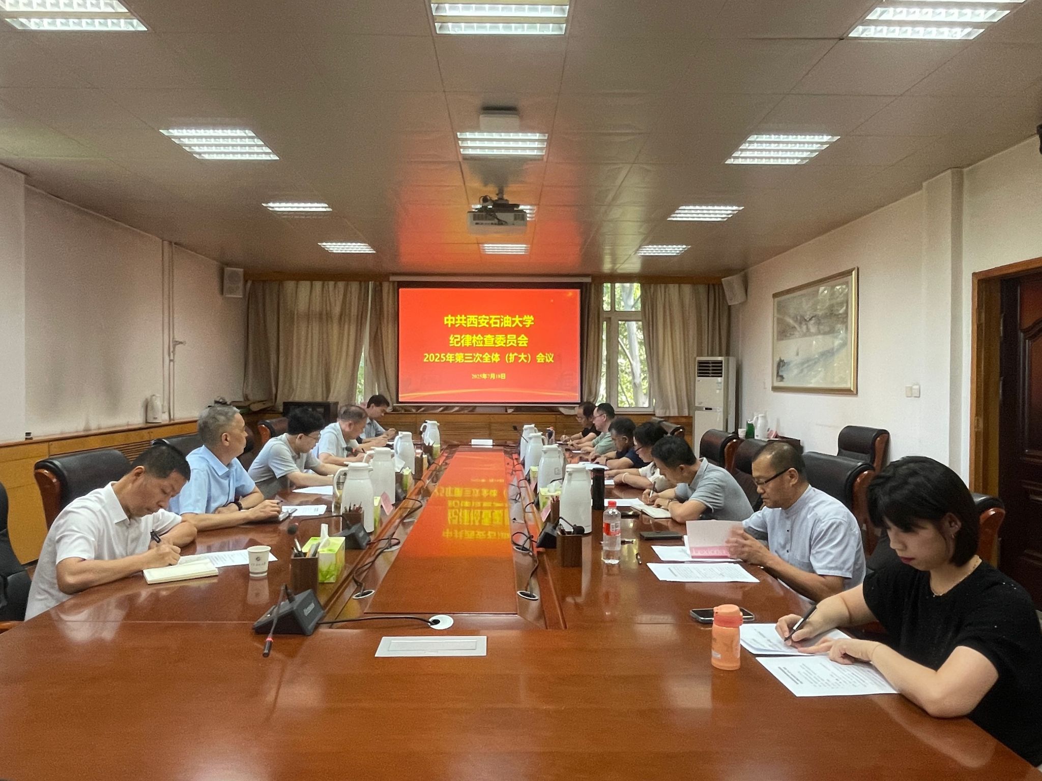 纪委在雁塔校区办公楼五楼会议室召开2025年第三次纪委会(扩大)会议。校党委副书记、纪委书记、监察专员王辉强主持会议并讲话。校纪委委员、纪检监察和巡察干部参加会议。