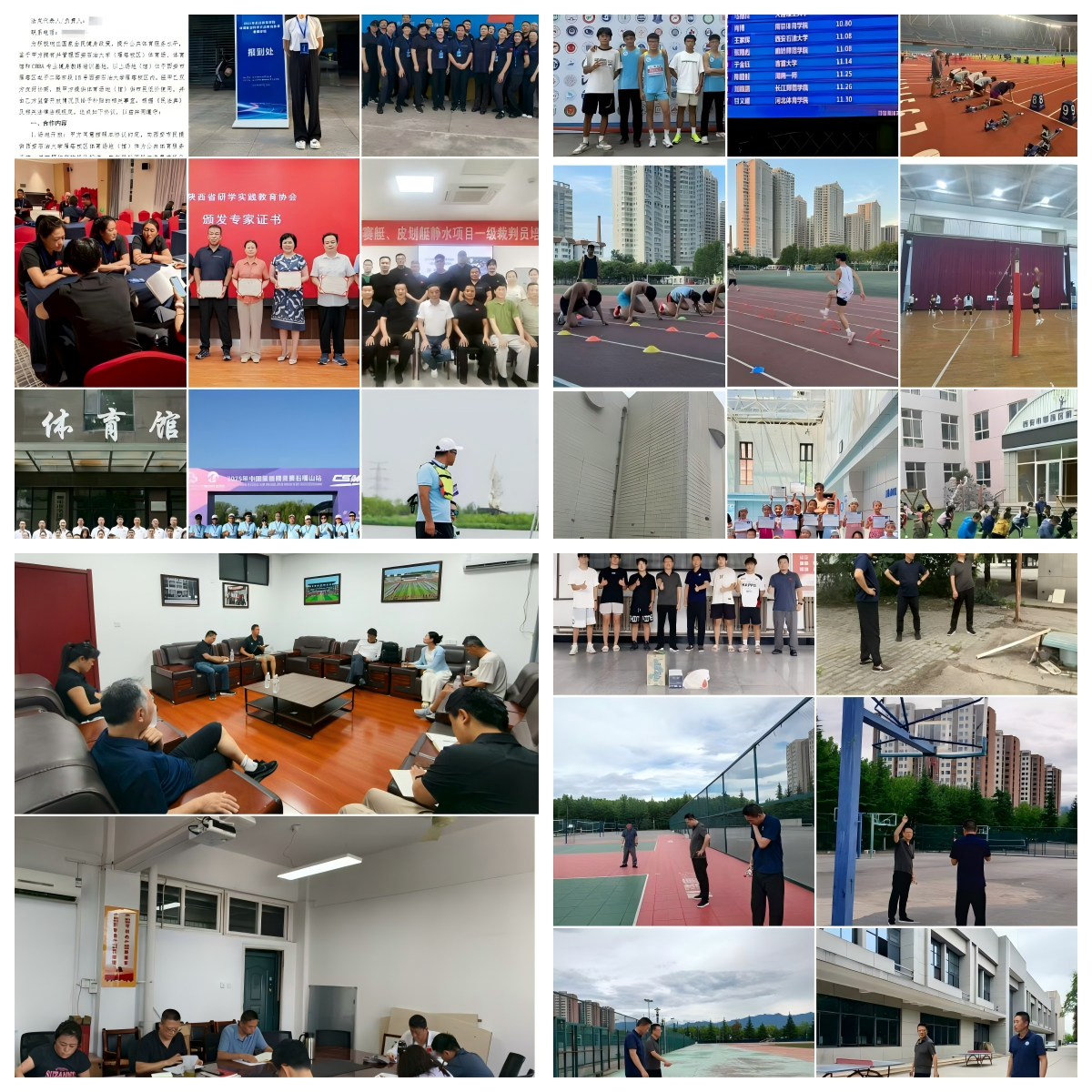 科研方法培训、省青少年赛艇锦标赛等多项研讨、培训;执裁3场中国桨板精英赛,1人获聘省研学实践专家。五是安全保障筑防线:慰问留校学生并动态管理安全;排查鄠邑校区场地隐患;有序完成雁塔校区办公室搬迁;射艺场地建设基本完工,保障新学期教学。