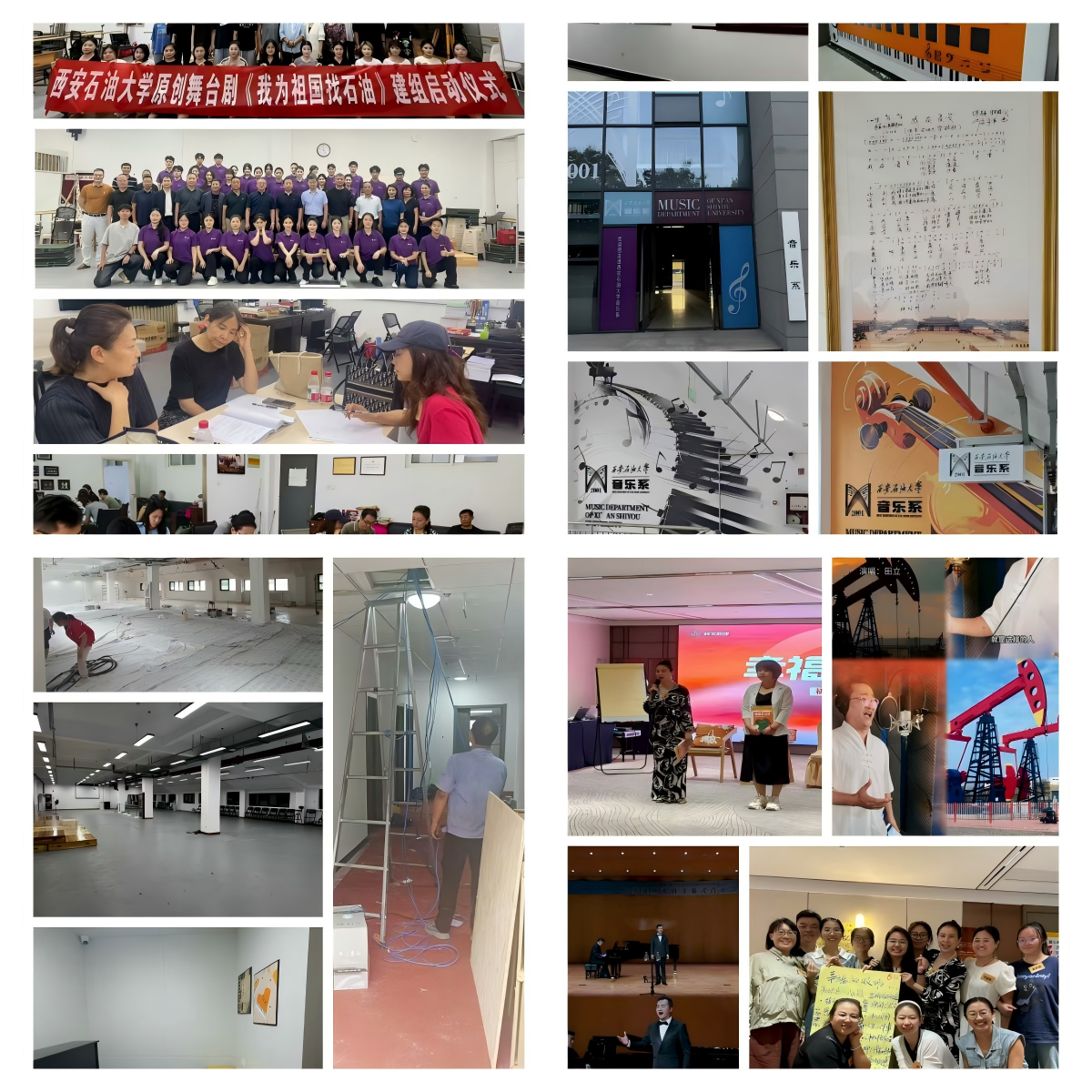 一是学科建设结硕果。原创音乐剧《我为祖国找石油——新中国第一支女子测量队》获批陕西省艺术创作重大资助项目,暑期团队封闭打磨剧目,确保高质量完成首演。二是教学服务再升级。完成鄠邑校区琴房“一卡通”预约系统建设、琴房声学构建及舞蹈/瑜伽教室维修升级,持续提升教学服务水平。三是环境育人润无声。设计鄠邑校区办公及公共空间文化宣传展示,通过墙体和展板呈现发展历程、办学特色等,营造浓郁艺术氛围,增强师生归属感。四是科研实践交流齐推进。积极推进与陕西戏曲研究院深度合作;校合唱团成功入选国家大剧院演出季,对接《云横秦岭》北京演出事宜;教师荣获“云岗杯”国际民族器乐展演金奖;精心录制的《石油人的歌》MV,以艺术之声礼赞石油精神;10余人次参加研修班,提升教师队伍素养。