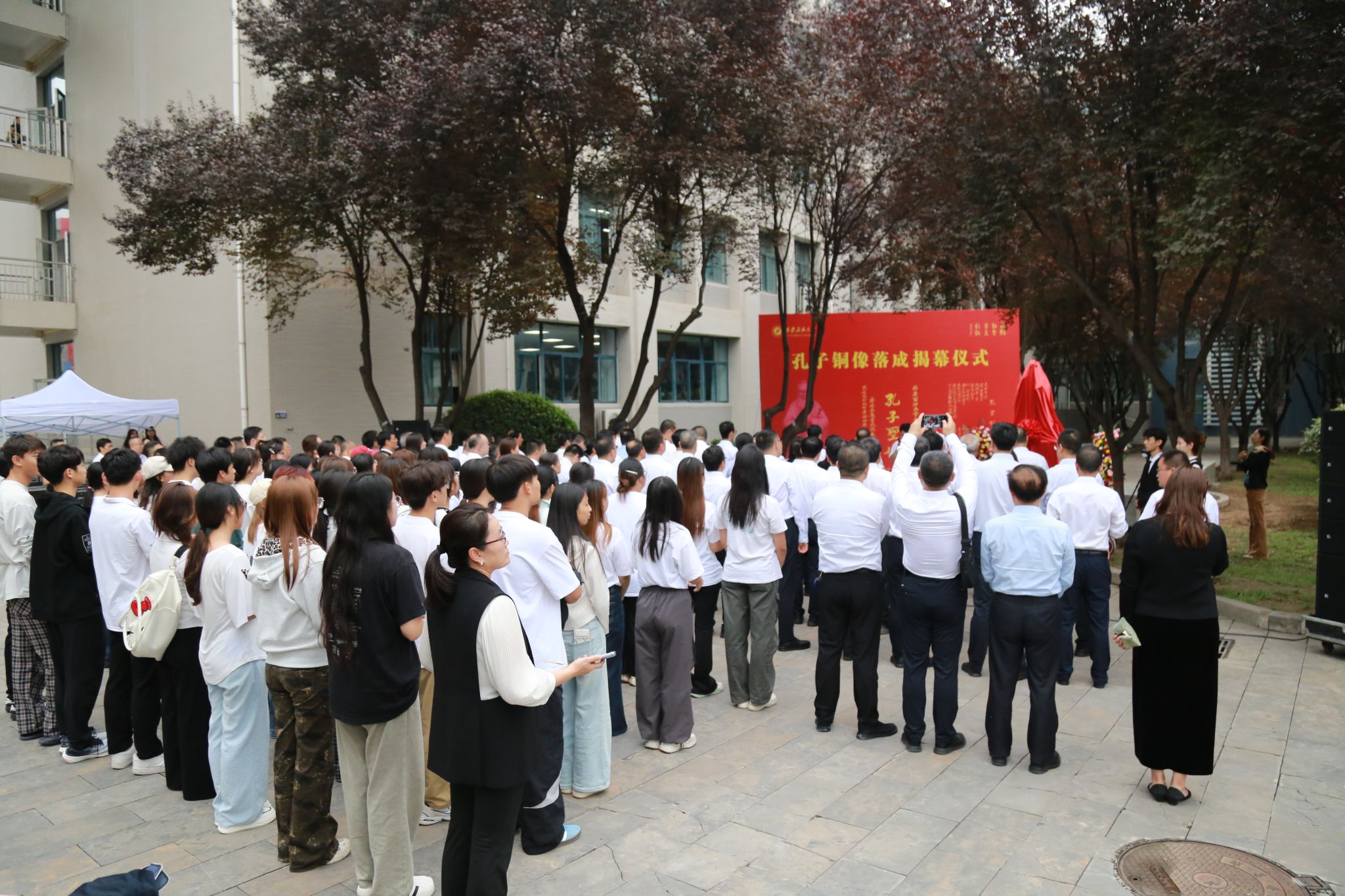 在鄠邑校区朝源广场举行孔子铜像揭幕仪式。校长王进富、校党委副书记张木、副校长张君涛,以及教师节受表彰教师代表、在鄠邑校区工作的正处级干部与学生代表共计150余人出席了本次活动。仪式由校党委副书记程永清主持。