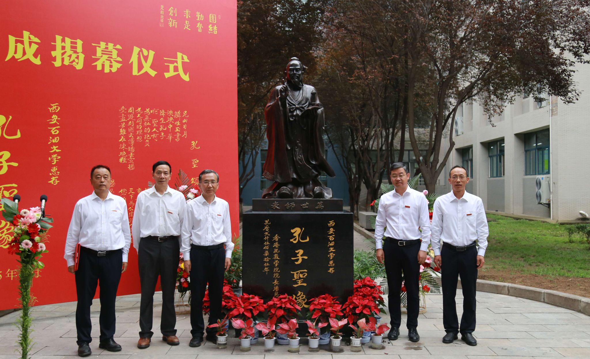 在全体与会人员的共同见证下,王进富、张木、张君涛、周德胜共同为孔子铜像揭幕。全体领导、师生代表向孔子铜像行鞠躬礼。