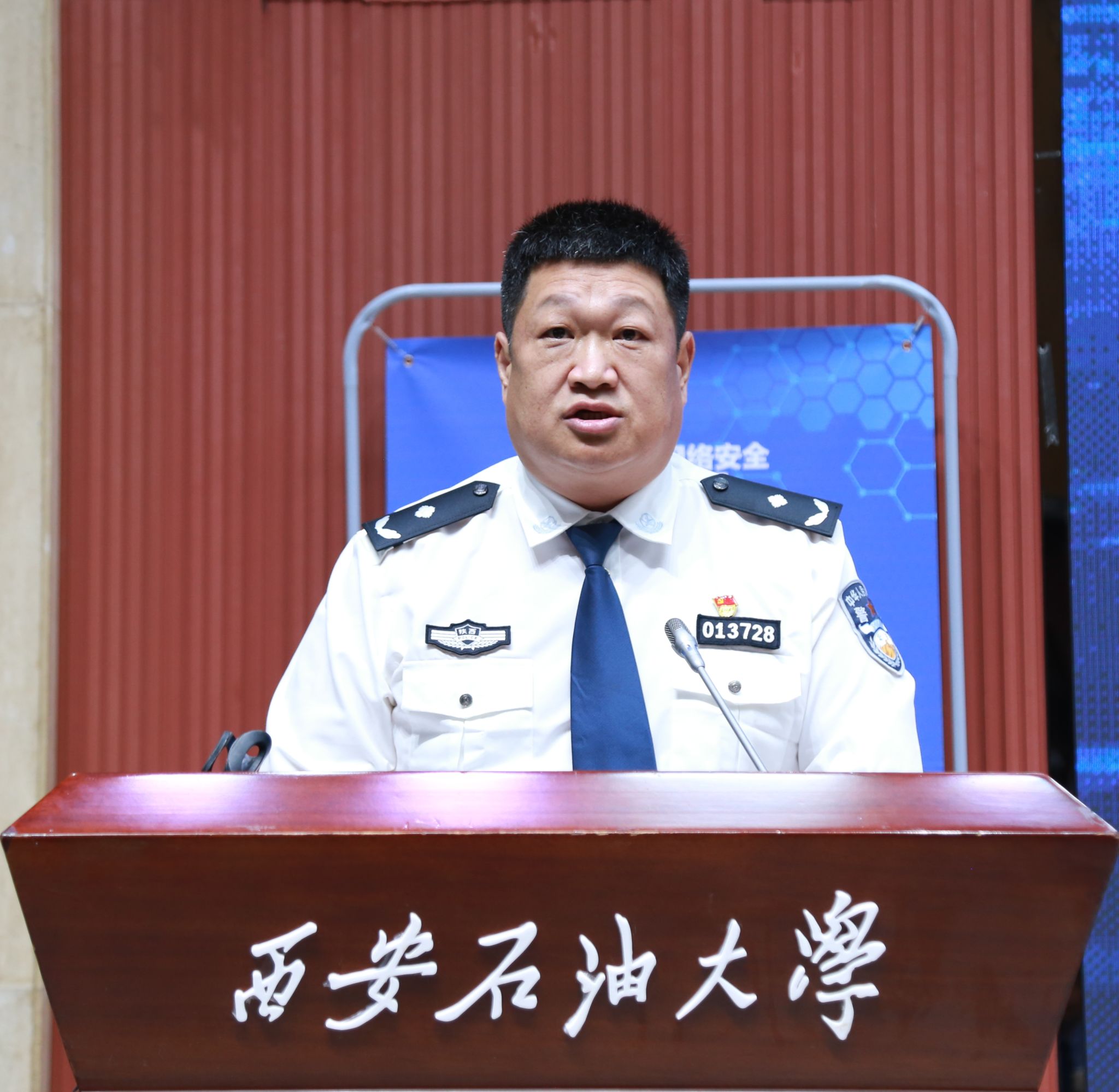 长期以来支持平安建设,积极参与“警校共治”的领导和广大师生们表示衷心的感谢。他强调,互联网带来了前所未有的便捷与机遇,但同时也潜藏着网络诈骗、个人信息泄露、不良信息侵袭,甚至邪教和毒品的网络渗透等诸多风险和挑战。他希望,通过继续深化“警校共治”工作,创新宣传形式、丰富活动载体,营造更加清朗、安全、和谐的网络环境和学习生活环境。他呼吁同学们能继续保持热情,积极传播安全知识,为校园安全乃至社会安宁贡献青春力量。