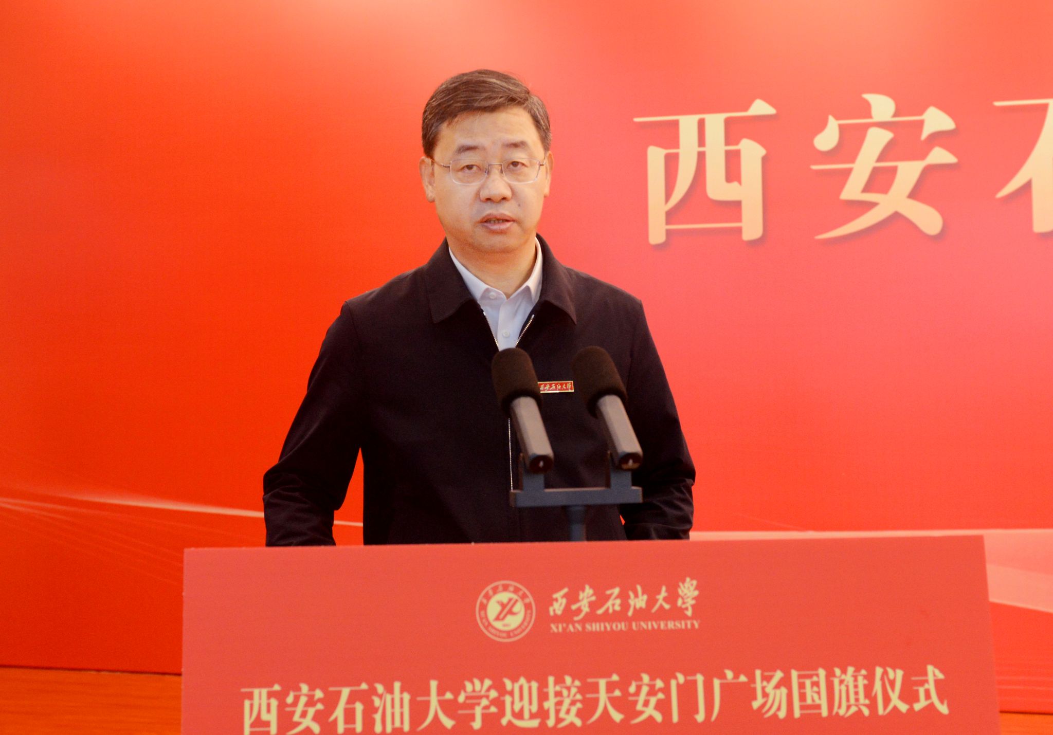 始终“以‘石’为基、以‘油’铸魂”, 在服务国家能源战略中彰显使命担当,培养了一批又一批能源领域的栋梁之才。他向全体师生提出三点希望:一是希望全体师生高擎信仰之炬,把弘扬爱国主义精神作为永恒主题。要持续发挥好这面国旗的爱国主义教育功能,开展内容丰富、形式多样的爱国主义教育活动,营造爱党爱国、爱校荣校的浓厚氛围;二是希望全体师生坚定强国信念,把践行奋斗实干担当作为精神底色。要坚持石油精神办学、铁人精神育人、延安精神铸魂,秉承“爱国奉献、艰苦奋斗、科学求实、开拓进取”的办学精神,全面落实立德树人根本任务,不断提升服务国家能源战略与区域发展的能力,在教育强国建设中展现更大作为;三是希望全体师生挺膺担当之志,把矢志能源报国使命作为毕生追求。广大教师要弘扬教育家精神,以赤诚之心、奉献之心、仁爱之心教书育人,做学生成长的引路人,广大学子要秉承“好学力行、自强不息”的校训,传承铁人精神,将使命扛在肩头,为国家能源事业贡献青春力量。