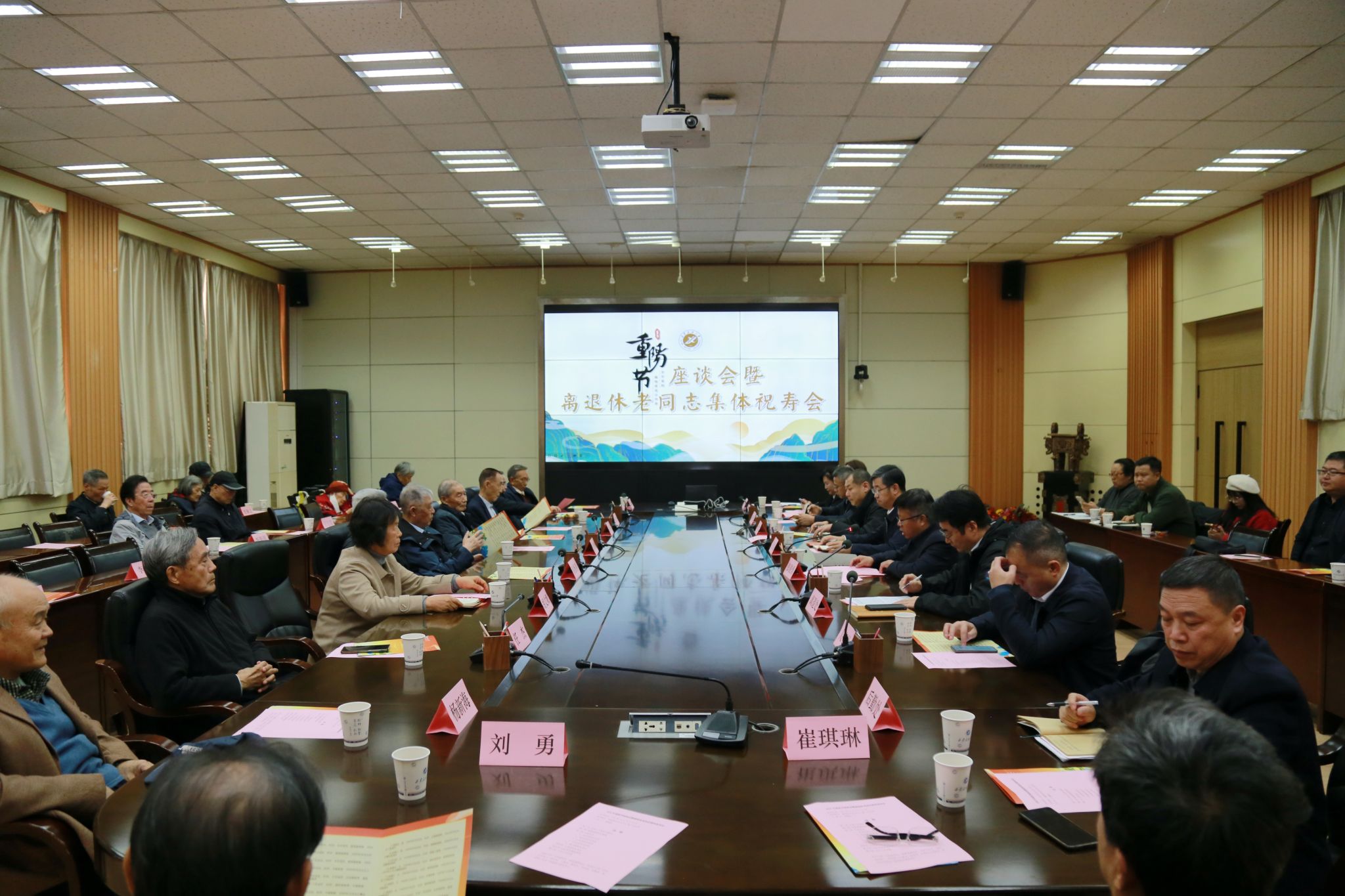 在雁塔校区第二会议室召开2025年重阳节座谈会暨80、85、90、95周岁离退休老同志集体祝寿会。校长王进富、副校长张骁勇出席,雁塔区人大代表、老寿星代表及特邀老同志代表参加会议,会议由离退休工作处处长黄建礼主持。