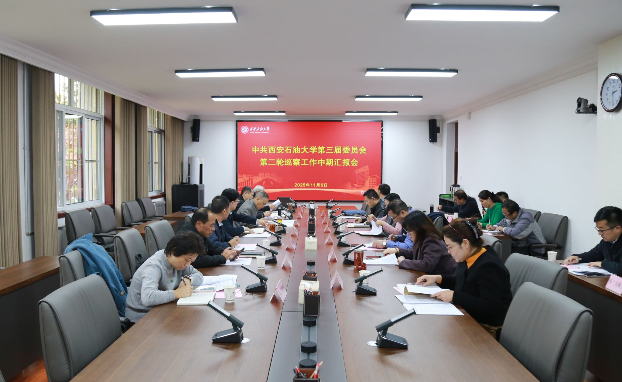 在鄠邑校区办公楼第三会议室召开党委巡察工作领导小组2025年第五次会议暨第三届党委第二轮巡察工作中期汇报会。校党委副书记、纪委书记、监察专员,党委巡察工作领导小组副组长王辉强出席会议并讲话。党委巡察工作领导小组成员单位主要负责人和第三届党委第二轮巡察第一、第二巡察组全体成员参加会议。会议由党委巡察办公室主任苟毅飞主持。