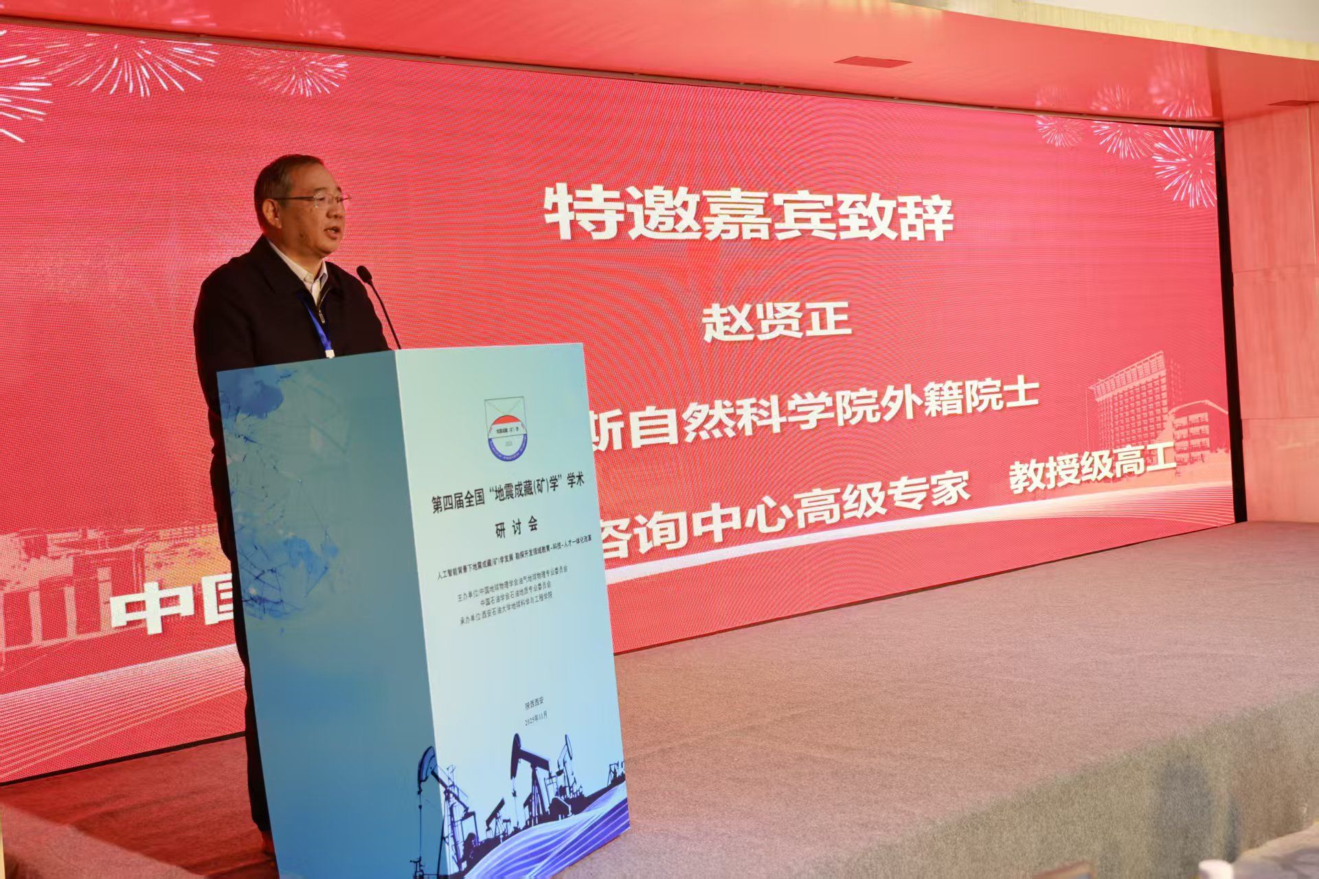 外籍院士、中国石油集团咨询中心高级专家赵贤正教授代表会议主办单位致辞。赵贤正表示,地震成藏(矿)学自2009年提出以来,已在理论与技术上取得显著进展,成为指导复杂地质条件下油气勘探的重要支撑,并呼吁广大科技工作者加强学科交叉与产学研合作,推动该学科向纵深发展,为我国能源勘探开发提供更强有力的理论和技术保障。