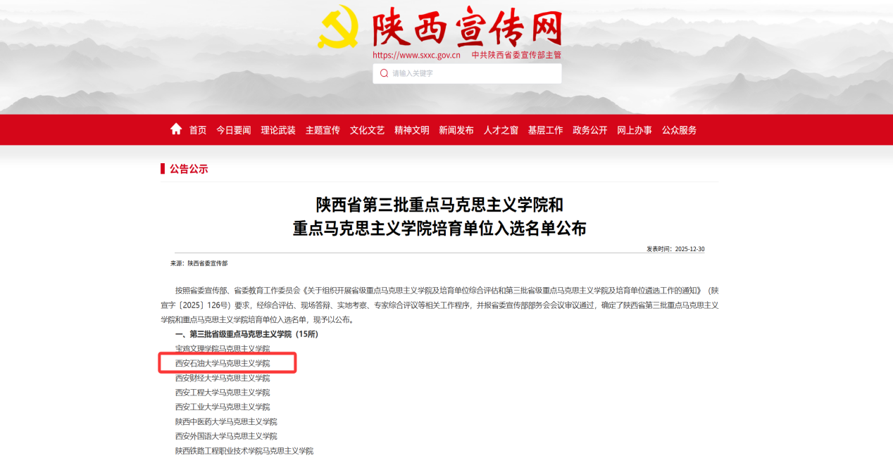 按照省委宣传部、省委教育工作委员会《关于组织开展省级重点马克思主义学院及培育单位综合评估和第三批省级重点马克思主义学院及培育单位遴选工作的通知》(陕宣字〔2025〕126号)要求,经综合评估、现场答辩、实地考察、专家综合评议等相关工作程序,并报省委宣传部部务会会议审议通过,确定了陕西省第三批重点马克思主义学院和重点马克思主义学院培育单位入选名单,德州扑克