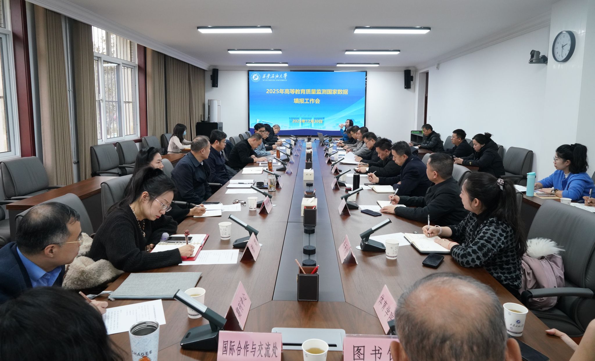 在鄠邑校区第三会议室召开2025年高等教育质量监测国家数据填报工作会。校长王进富、副校长赵健出席会议,党委办公室(校长办公室)、党委组织部、党委学生工作部、党委教师工作部、团委、发展规划处、人事处、教务处、实验室管理处、科研处、研究生院、研究生工作部、财务处、国有资产处、国际合作与交流处、高教研究与评估督导中心、图书馆、期刊中心、体育学院主要负责人,各单位数据填报老师参加了会议。会议由高教研究与评估督导中心主任时保宏主持。