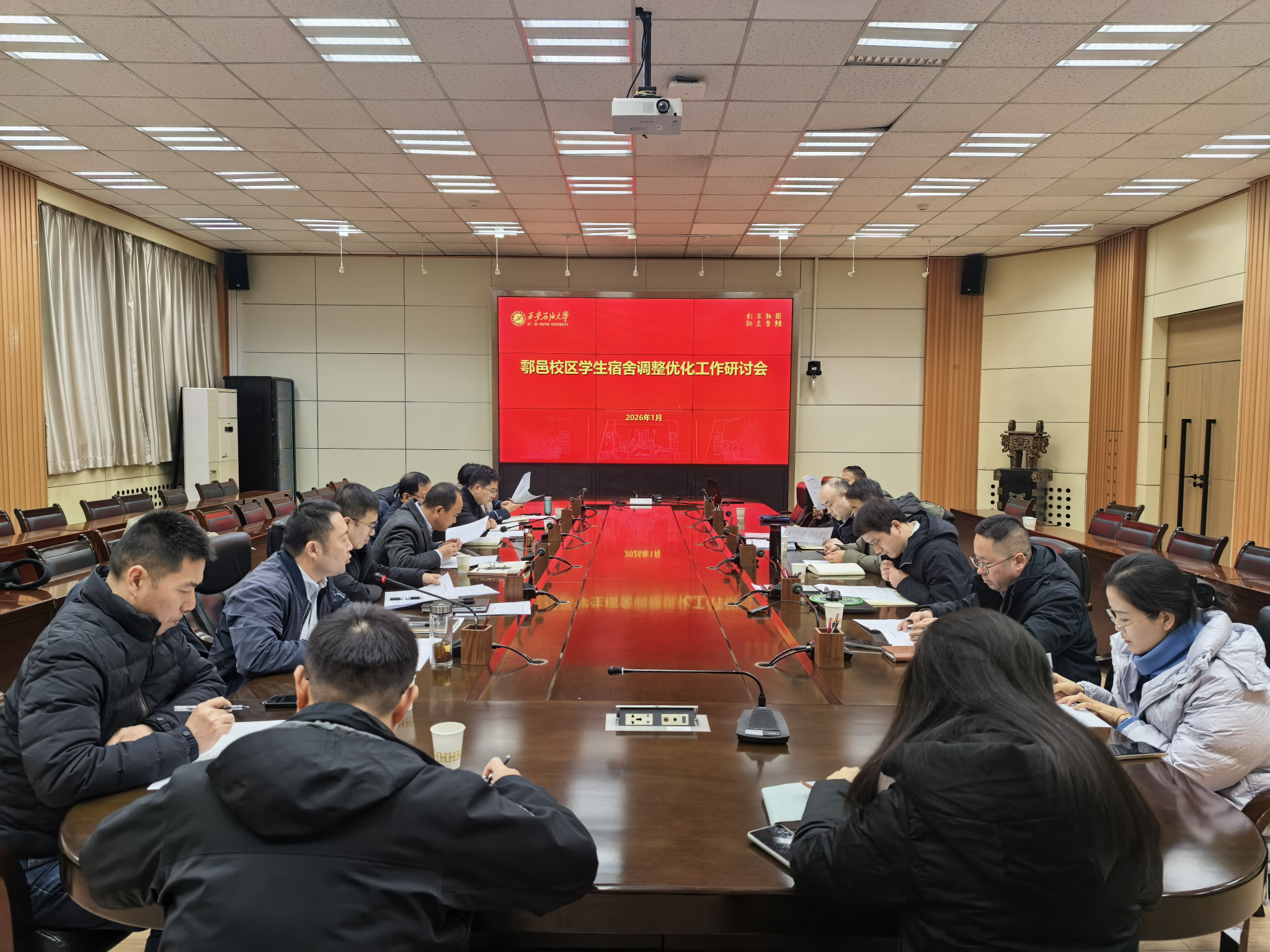 在雁塔校区会议中心第二会议室召开鄠邑校区学生宿舍调整优化工作研讨会,副校长赵健、种宇宏出席会议并讲话,学生工作部、发展规划处、研究生工作部、财务处、国有资产处、后勤处等职能部门负责人参会。会议由学生工作部部长王亮主持。