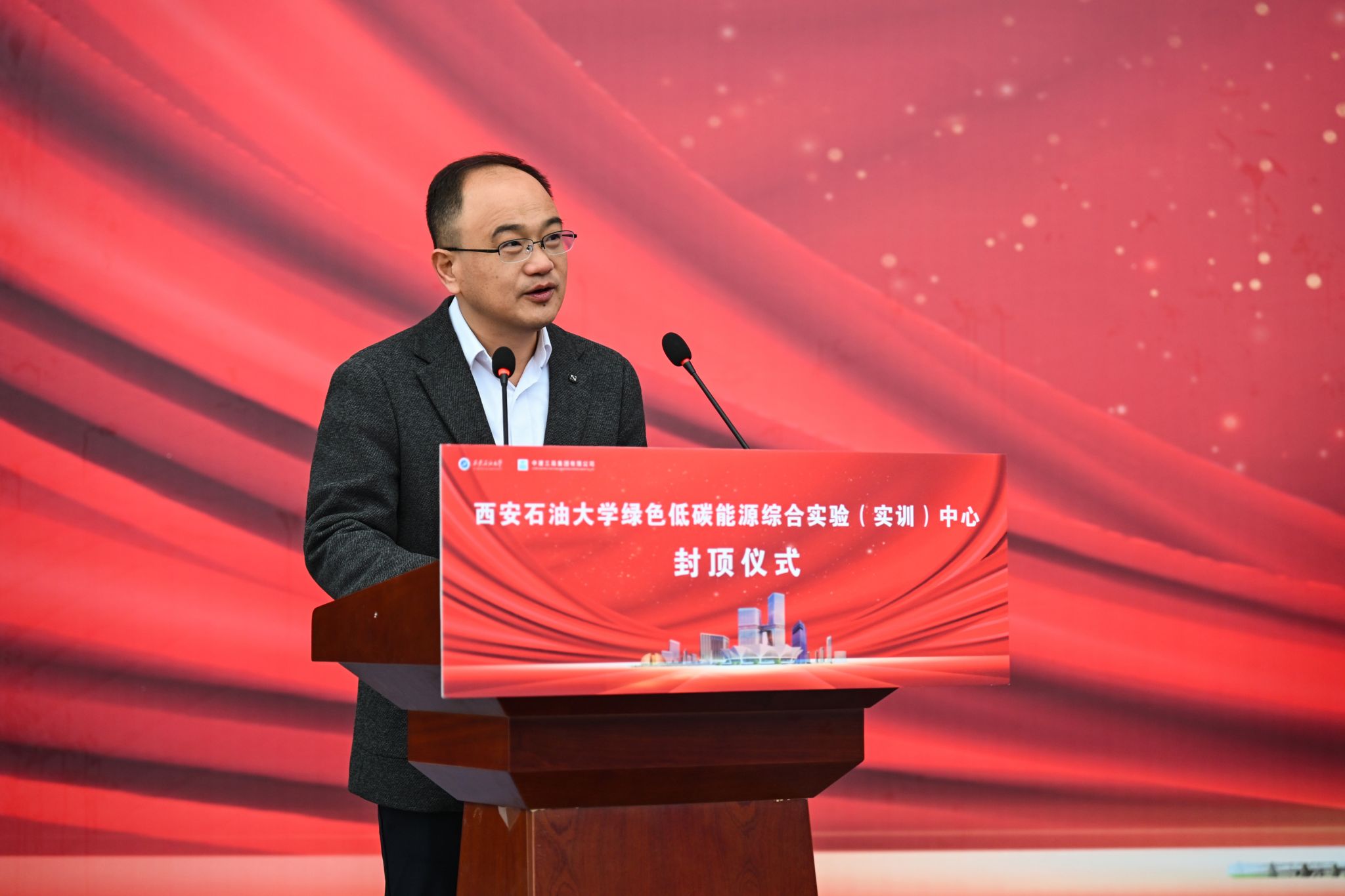 仪式上,中建三局集团西北公司党委副书记、总经理江少兵代表施工单位致辞。他表示,中建三局始终保持高度责任感,充分发挥科教文卫产品线优势,科学策划、高效实施,严控质量、创新工艺,以最高标准、最严要求、最优资源全面投入绿色低碳楼项目建设,同步提升施工效率与建造品质,以实际行动达成项目主体结构较计划提前三个月完成封顶的优异成绩。在接下来的工程建设中,中建三局将始终秉持“以客户为中心”的理念,科学组织、严格管理、精心施工,紧盯目标节点、聚合优势资源,确保将本项目打造成为经得起时间和历史检验的精品工程、品牌工程,不负领导信任、不负学子所盼。