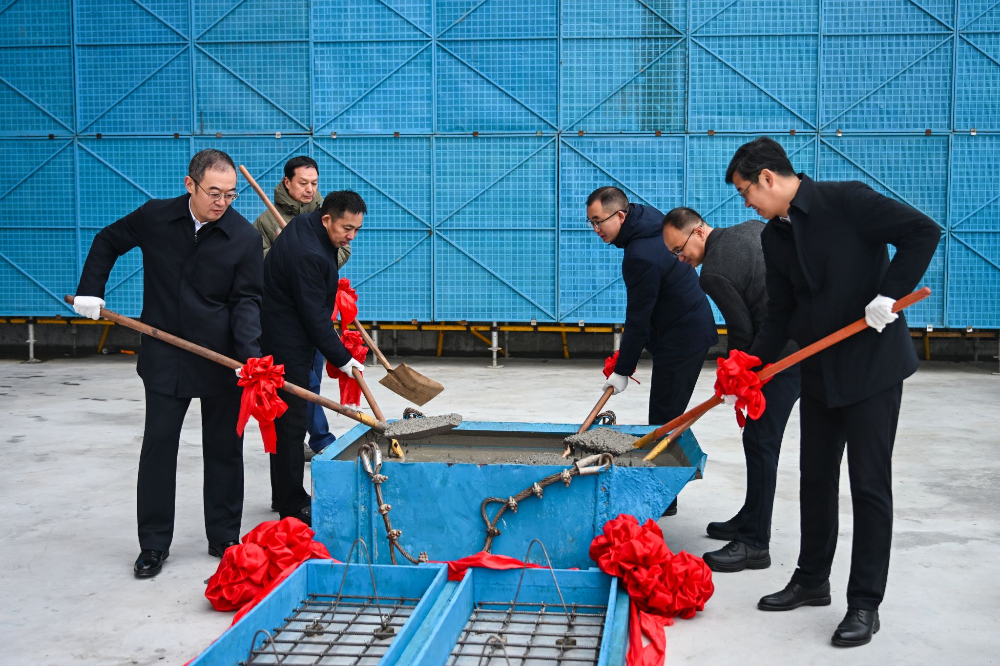 仪式最后,伴随着奏乐声,参加仪式的各位领导挥锹上料。随着最后一方混凝土浇筑完成,绿色低碳楼项目主体结构全面封顶。