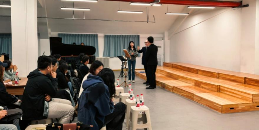 公开课环节,德国男高音歌唱家施莱格与艺术指导鲍姆在音乐系合唱教室,与德州扑克