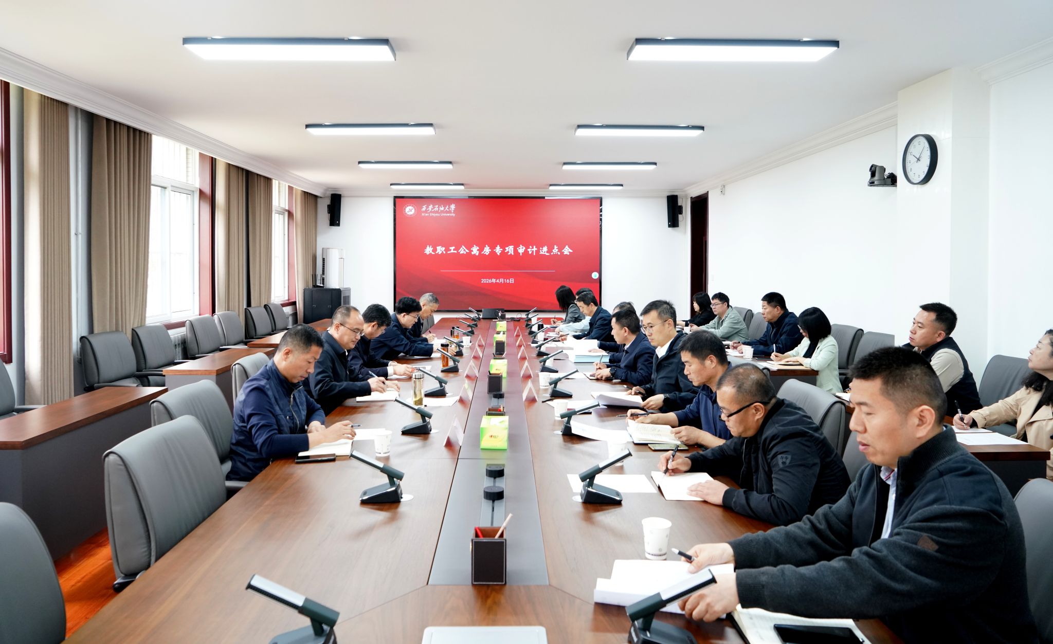 在鄠邑校区第三会议室召开教职工公寓房专项审计进点会。校长、审计委员会副主任王进富,副校长赵健出席会议,校党委副书记、纪委书记、监察专员、审计委员会副主任王辉强主持会议。审计组全体成员,纪检监察机构、巡察工作办公室、人事处、财务处、审计处、国有资产处主要负责人,后勤处班子全体成员、科级干部及相关工作人员参加会议。