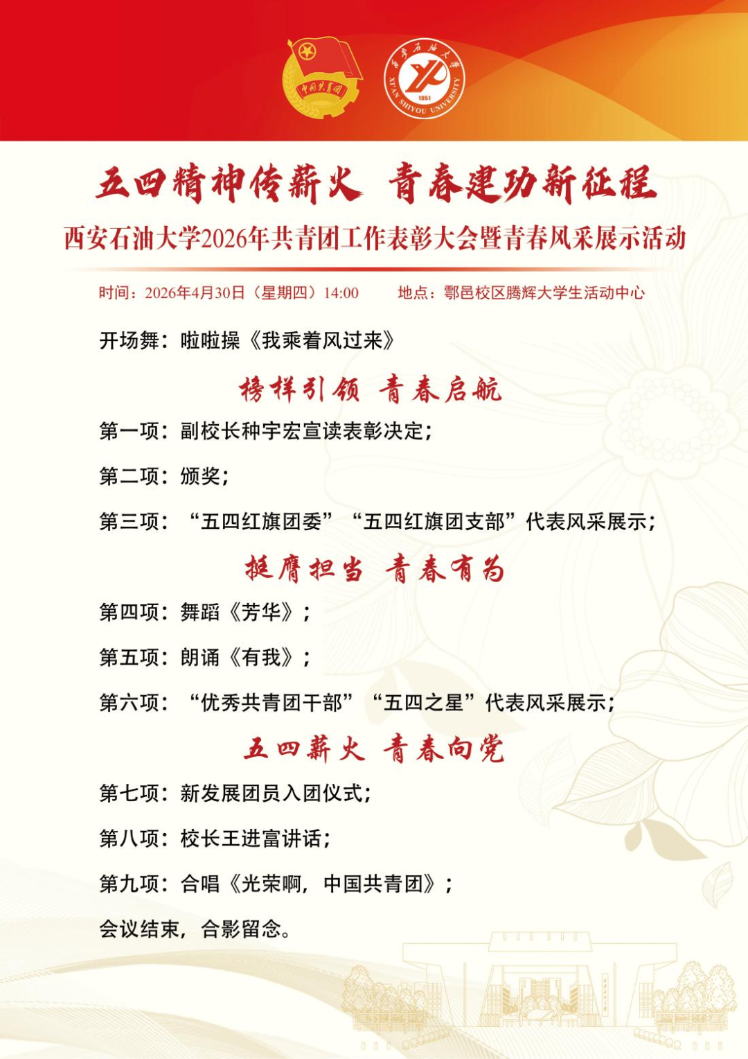 2026年共青团工作表彰大会暨青春风采展示活动在鄠邑校区腾辉大学生活动中心举行。校长王进富,副校长种宇宏,党委办公室(校长办公室)、党委组织部、党委宣传部、党委学生工作部、党委教师工作部、党委保卫部、人事处、教务处、研究生工作部、后勤处、马克思主义德州扑克