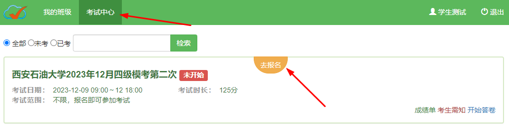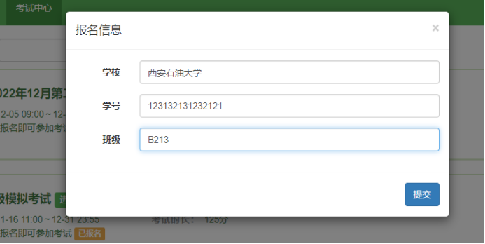 2、登录成功后点击“考试中心”,点击对应的场次“去报名”,填写好自己的个人信息,点击确定后即可报名成功,要保证个人信息无误,避免影响成绩。(班级填写教学班,如B213)