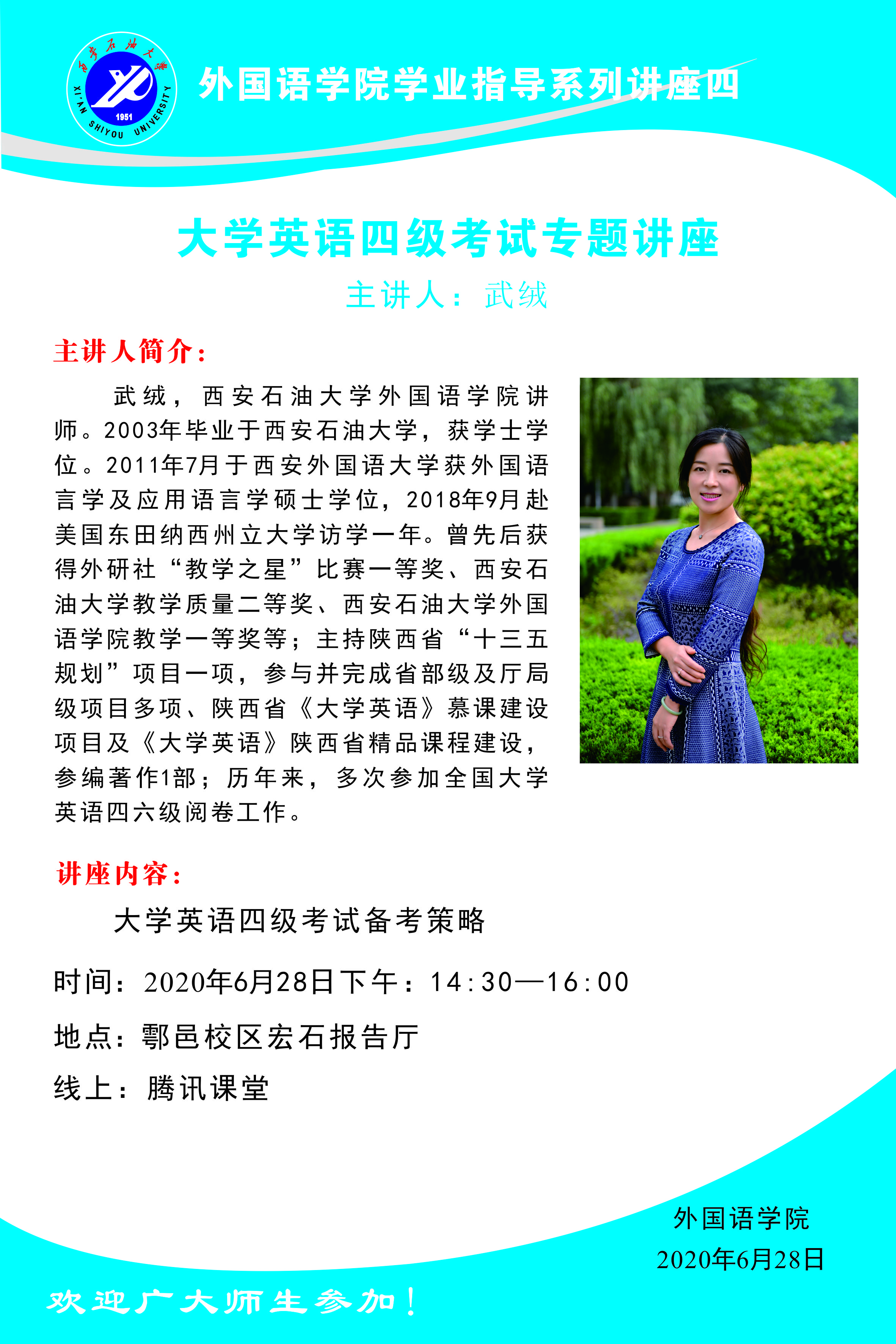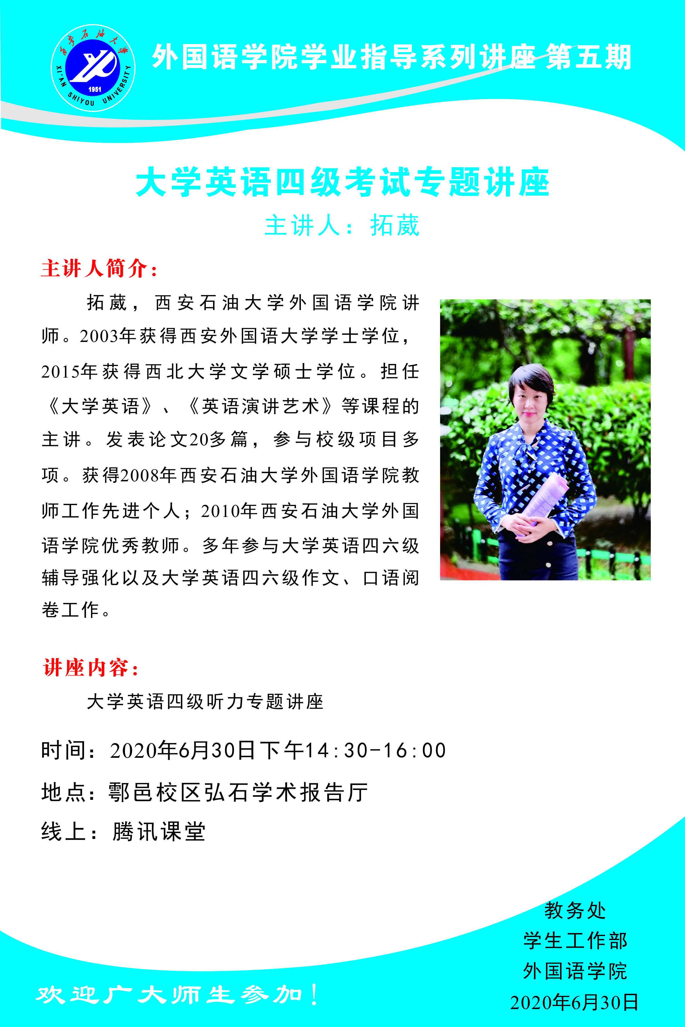 为提高德州扑克 学生英语语言应用能力,提高大学英语四级通过率,外国语德州扑克 于2020年6月28日-7月9日和11月25日-12月9日分别举办大学英语四级讲座共计十三场,讲座由外国语德州扑克 优秀骨干教师担任主讲,分为听力、阅读、写作、翻译、应考策略、真题解析等板块。讲座内容包括大学英语四级考试的变化趋势、大学英语四级考试题型、出题规律及大学英语四级考试应试策略及注意事项。