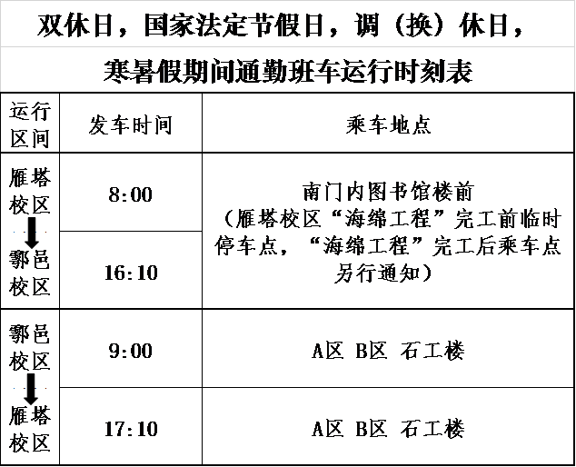 9月2日(周一)起恢复通勤班车教学周期间各正常运行班次, 请各位教职工持校园卡主动刷卡乘车,运行时间详见附表。