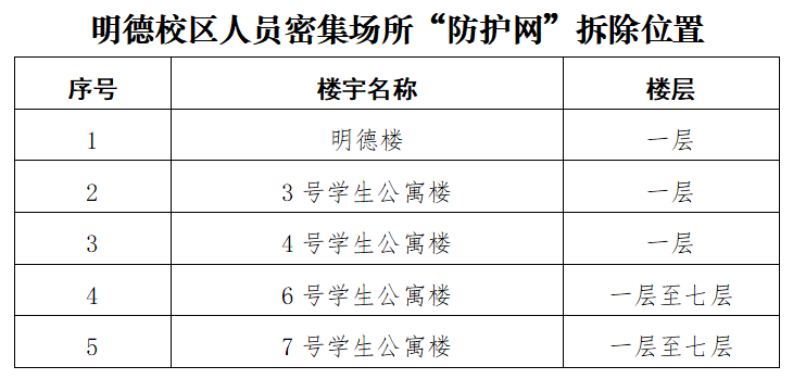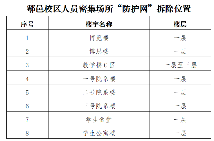 根据陕西省教育厅办公室转发《陕西省消防安全委员会办公室关于进一步加强人员密集场所“拆窗破网”专项工作的通知》(陕消安委办发〔2024〕28号)要求,经德州扑克 研究决定,计划于6月21日至6月30日期间对德州扑克 雁塔、明德、鄠邑三校区人员密集场所“防护网”进行拆除作业,请各单位予以配合,同时做好“防护网”拆除后的安全管理工作。本次“防护网”拆除区域及位置附后。