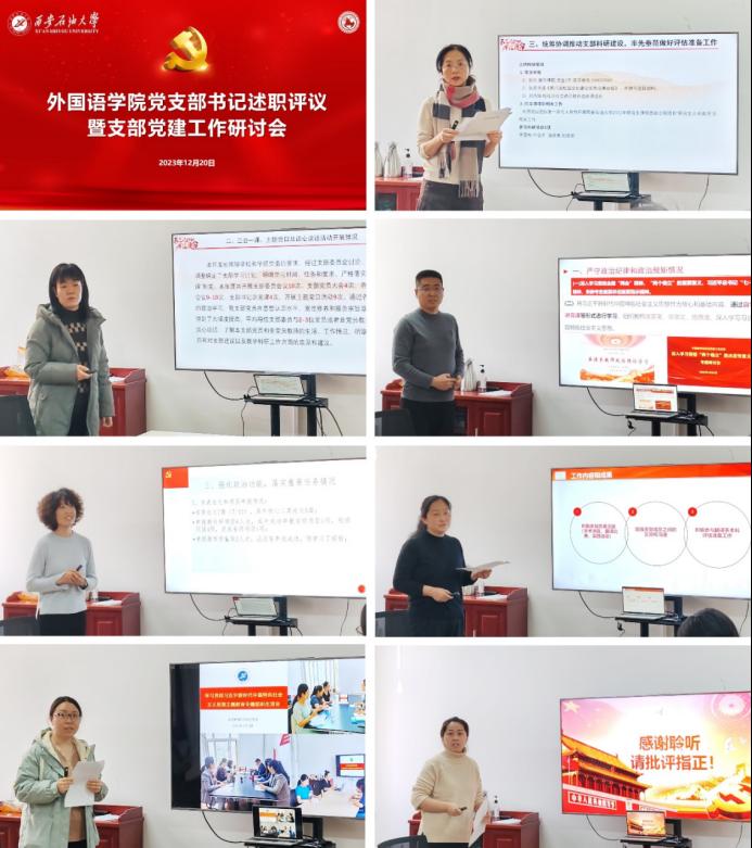 大学外语第一教学部、大学外语第二教学部、英语系、俄语系、翻译系、多语种教学部教工党支部及英语系学生党支部7名支部书记作现场述职,3个学生党支部进行书面述职。述职会上,各党支部书记围绕落实党的二十大精神和学习贯彻习近平新时代中国特色社会主义思想主题教育开展情况,全面汇报了2023年党支部标准化规范化建设、履行党建工作责任、落实党建工作任务、抓党建促发展等情况,深刻剖析支部工作存在的不足,并提出下一步党建工作的思路对策和设想。