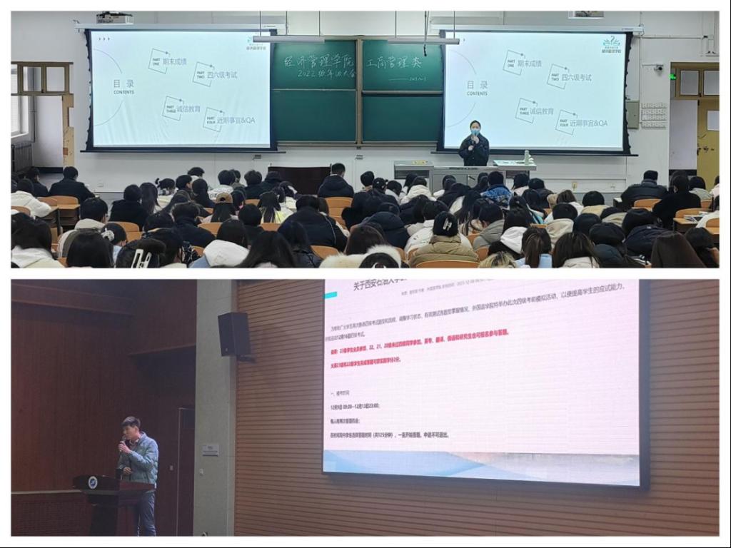 武绒老师主讲,全院共计200余名学生参加。在培训中,武绒老师为大家讲解了四级考试的整体流程,对各题型的考场时间规划提出有效建议,对近年考试真题进行解析,讲解写作技巧及翻译要点、总结听力妙招、传授阅读板块做题方法等,为大家提供了针对性的复习策略。