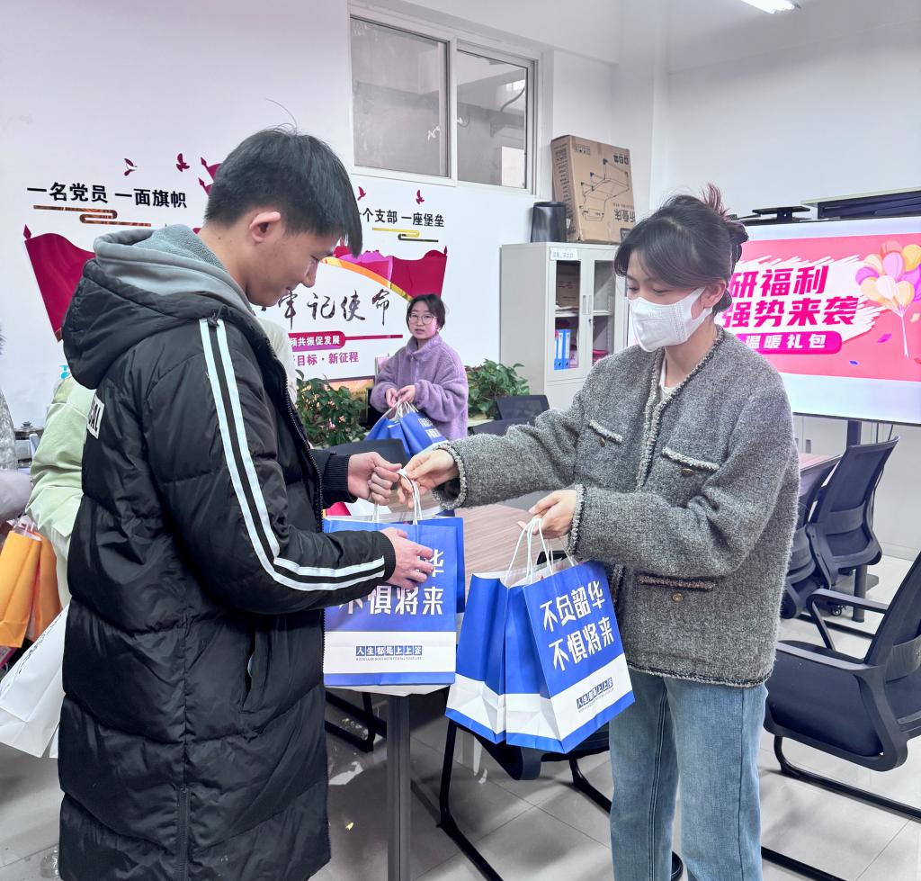 为每位考研学生精心准备了“考研温暖大礼包”。包括需要万事“具”备的考研文具袋、不惧寒冬的暖手宝、提神醒脑的咖啡、透明玻璃杯提醒同学们多喝水,临近考试注意身体,以饱满的精神状态迎接考试,每位同学的礼品袋上也是美好的寓意,祝愿大家未来可期、前程似锦、好运将至,还有德州扑克