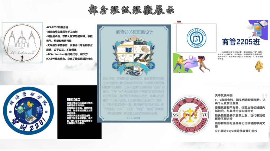 2022级、2023级各班级,自11月初开始作品征集,鼓励班级全体成员参与设计,群策群力,发挥自身特长。经过首轮评审,共有11个班级进入决赛。在决赛中,各班以视频、PPT、舞蹈、朗诵等形式全方位展示班级风采。商管2305班以初心如磐,行稳致远,坚定信仰,奋楫笃行作为他们的行为规范,“在青春路上尽情展现自我”是他们的班级特色,班歌《我的未来式》体现了商管2305班同学对未来的期望与憧憬,以及敢于追梦,争取圆梦的斗志与激情。智财2201将“智勇双全,爱拼财会赢”作为本班的班训,班徽设计主体以科技蓝为主色调,象征着信息和科技,融合信息网络系统,财会系统流程等设计元素。国贸2202班以“严于律己,宽以待人”为关键词,勉励每一位同学变得更好,更加优秀。“既要仰望星空,又要脚踏实地”是他们的宣言。经过激烈的角逐,商管2305班荣获一等奖,智财2201班和国贸2202班荣获二等奖,商务2301班、ACA2302班、商管2304班荣获三等奖,商管2205班、金融2201班、ACA2202班、ACA2301班、商管2308班荣获优秀奖。