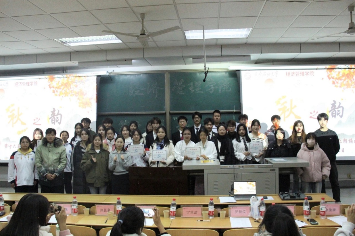 2022级本科生周靖雨、李铟彤分别为大家带来了精彩的歌曲表演。比赛结束后,评委根据参赛选手现场表现进行打分,经管2302孙乾炳、曹嘉豪,ACA2301黄俊杰,经管2301周恬皙获得一等奖获。任仰为获奖选手颁奖,参赛同学合影留念。