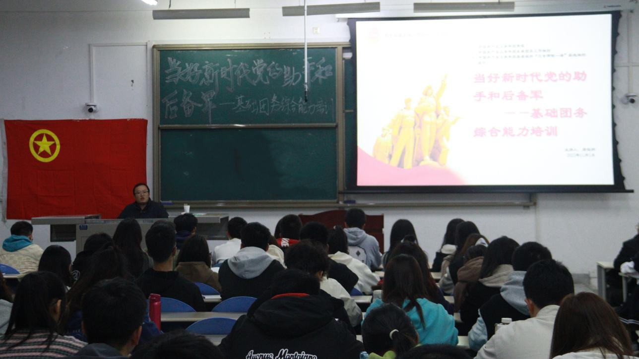 团委书记周钰铜在鄠邑校区博思楼101教室,以《当好新时代党的助手和后备军---基础团务综合能力培训》为题,围绕团章是什么、为什么学习团章两个角度,对《中国共产主义青年团章程》进行了学习解读,引导同学们进一步学习理解中国共产主义青年团的性质、使命和基本任务,特别是结合《中国共产主义青年团基层组织“三会两制一课”实施细则(试行)》,对“三会两制一课”、发展团员流程、规范使用团旗、团徽等知识进行了重点讲解,希望广大同学坚持以习近平新时代中国特色社会主义思想为指引,深入学习习近平总书记关于青年工作的重要论述,争做一名合格的共青团员。