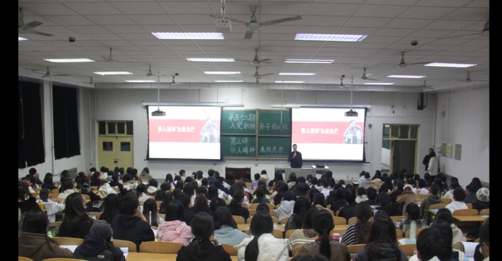 第五十二期入党积极分子培训班第三讲在鄠邑校区博览楼239教室举行,本次培训以“铁人精神永放光芒”为主题,由校团委书记何国强主讲,第五十二期全体入党积极分子参加。