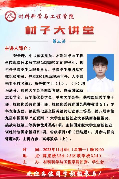 在鄠邑校区博览楼324教室举办“材子大讲堂”第五讲—高等数学(上),本期主讲学生是焊接(卓越)2101班张云轩同学,德州扑克