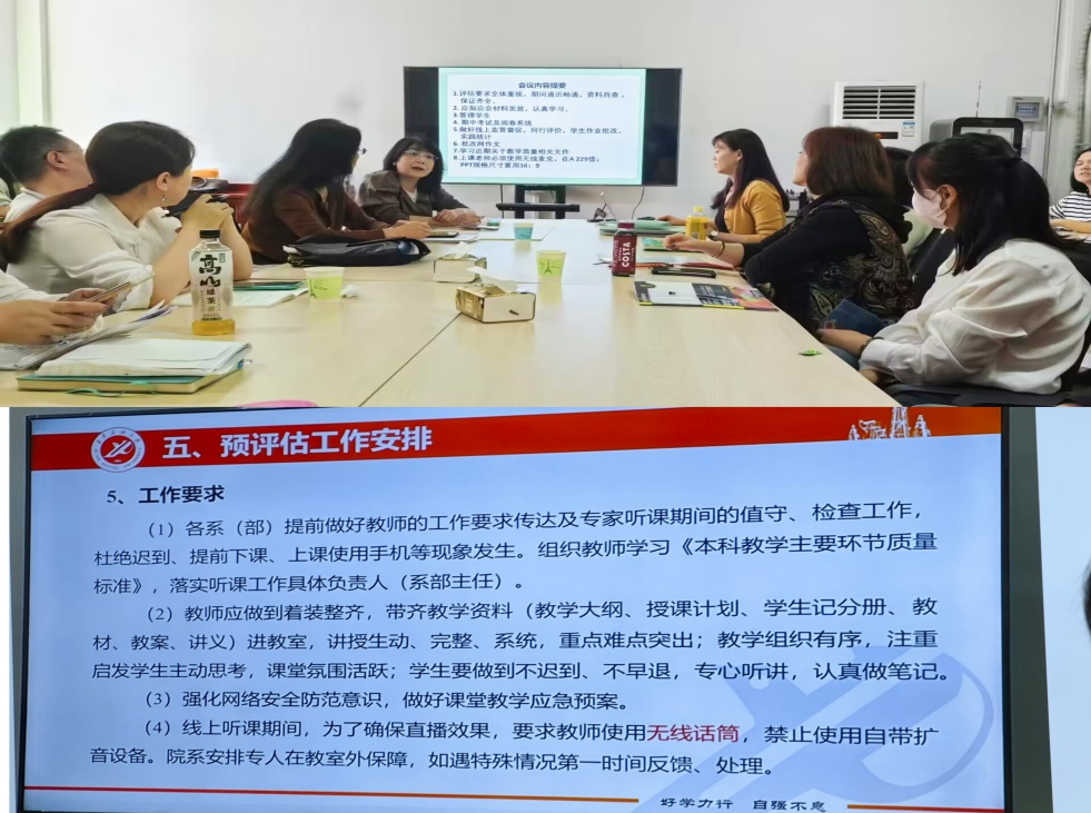 在教学工作会议环节,大学外语第一教学部主任李雪梅就近期教学工作及本科教育教学预评估和期中考试等工作作了详尽安排。李雪梅指出,本科教学评估有利于规范教学管理,提升教学质量,各位教师务必认真学习评估“应知应会”手册,严格遵守并执行各项教学规范和要求。